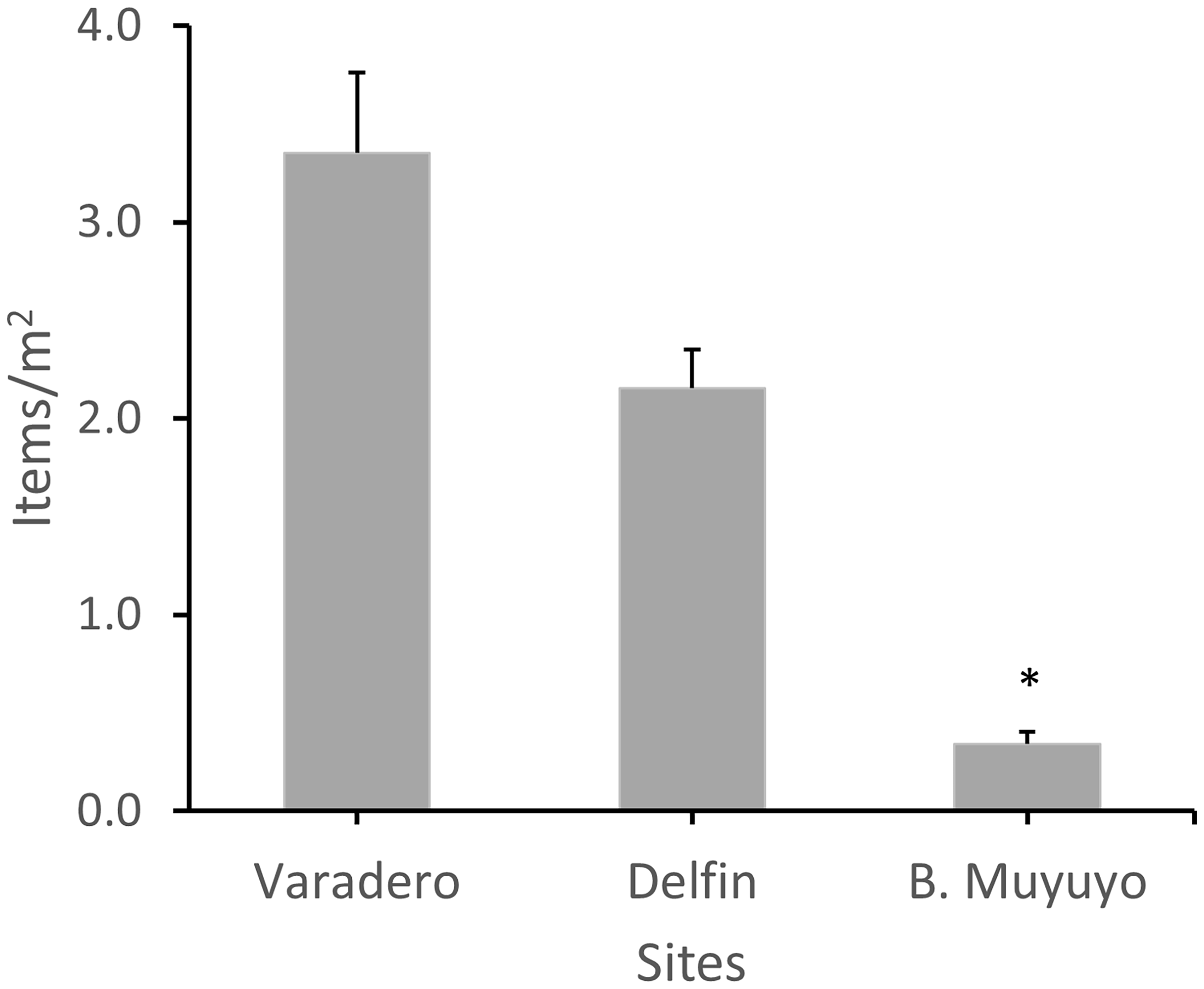 The cross-section analysis revealed that the backshore of Varadero and Delfin beaches accumulated on average 27.3 and 17.2 items/m2, respectively. Bahia Muyuyo only showed 2.7 items/m2 on average. Moreover, the results from repeated measures analysis showed that the AMD abundance in each study site presented a significance difference with respect to temporality in months and sites sampled (P=0.04, F=6.24).