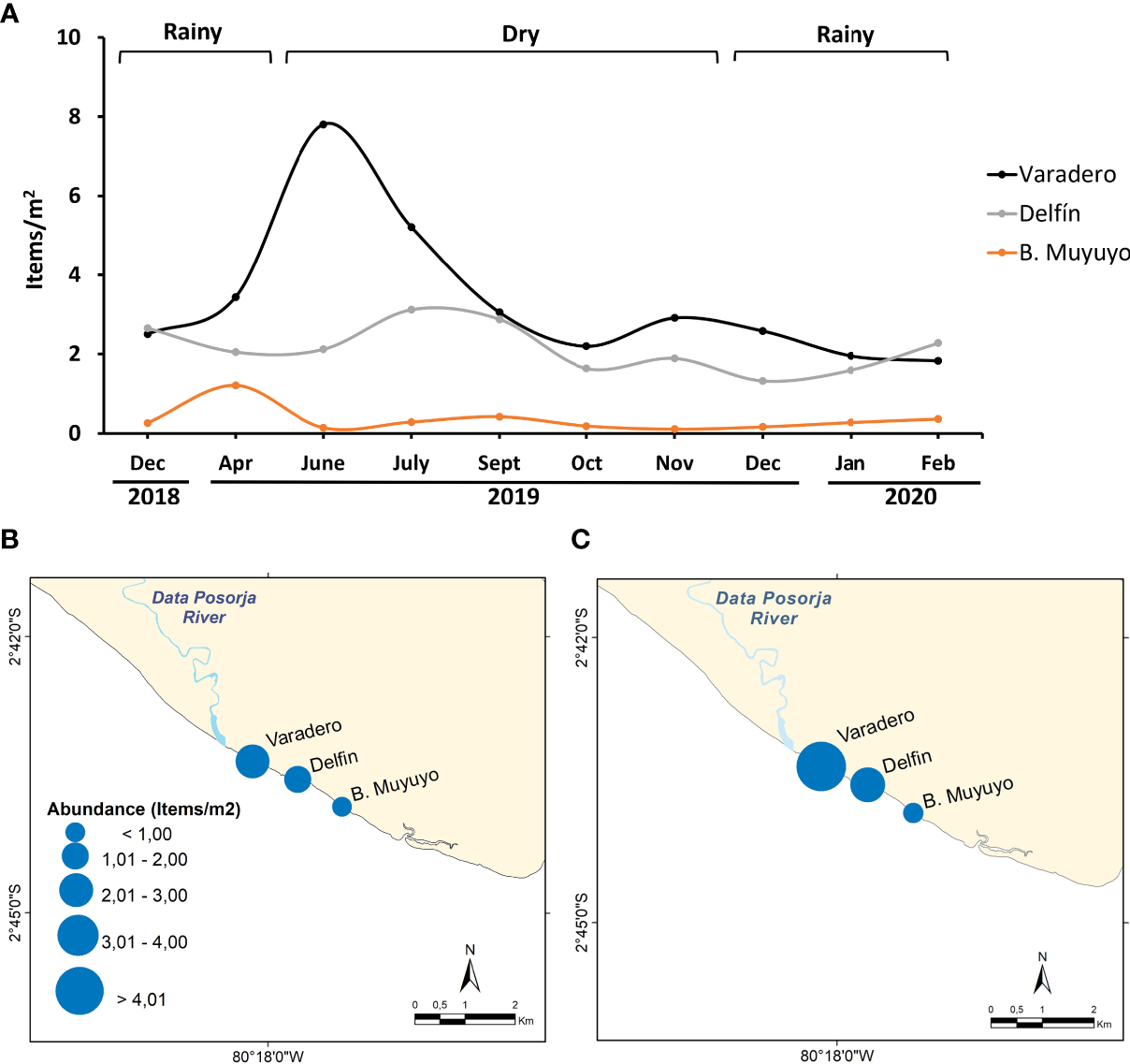 Changes in temporal AMD abundance on Data de Posorja, Guayas. (A) AMD abundance registered over the periods 2018, 2019 and 2020. (B) AMD distribution during rainy season, (C) AMD distribution during dry season. Size of blue points indicates the abundance (items/m2).