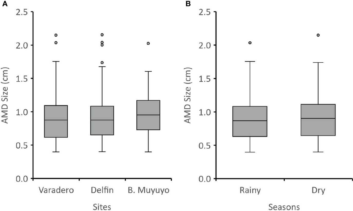 AMD size per sites (A) and seasons (B) on Data de Posorja, Guayas (Ecuador). Data was transformed using log10. Significant differences were observed among sites and seasons.