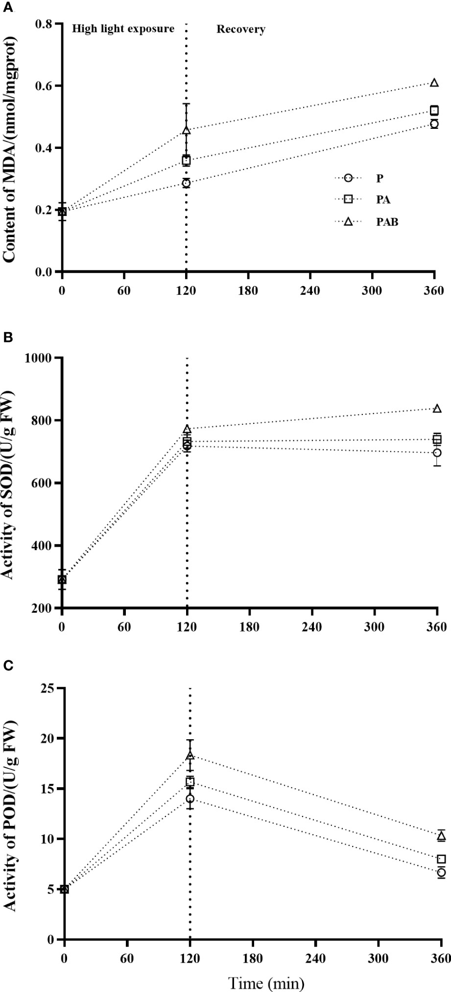 The activity of SOD increased 2.47, 2.52 and 2.66 times over that of the initial value at time 0 by P, PA and PAB treatments respectively, with significant difference between P and PAB treatments (P<0.001), and showed stabilization during the 240-min recovery. The activity of POD showed a similar trend of increase during the P, PA and PAB exposure, but decreased when shifted to low light.