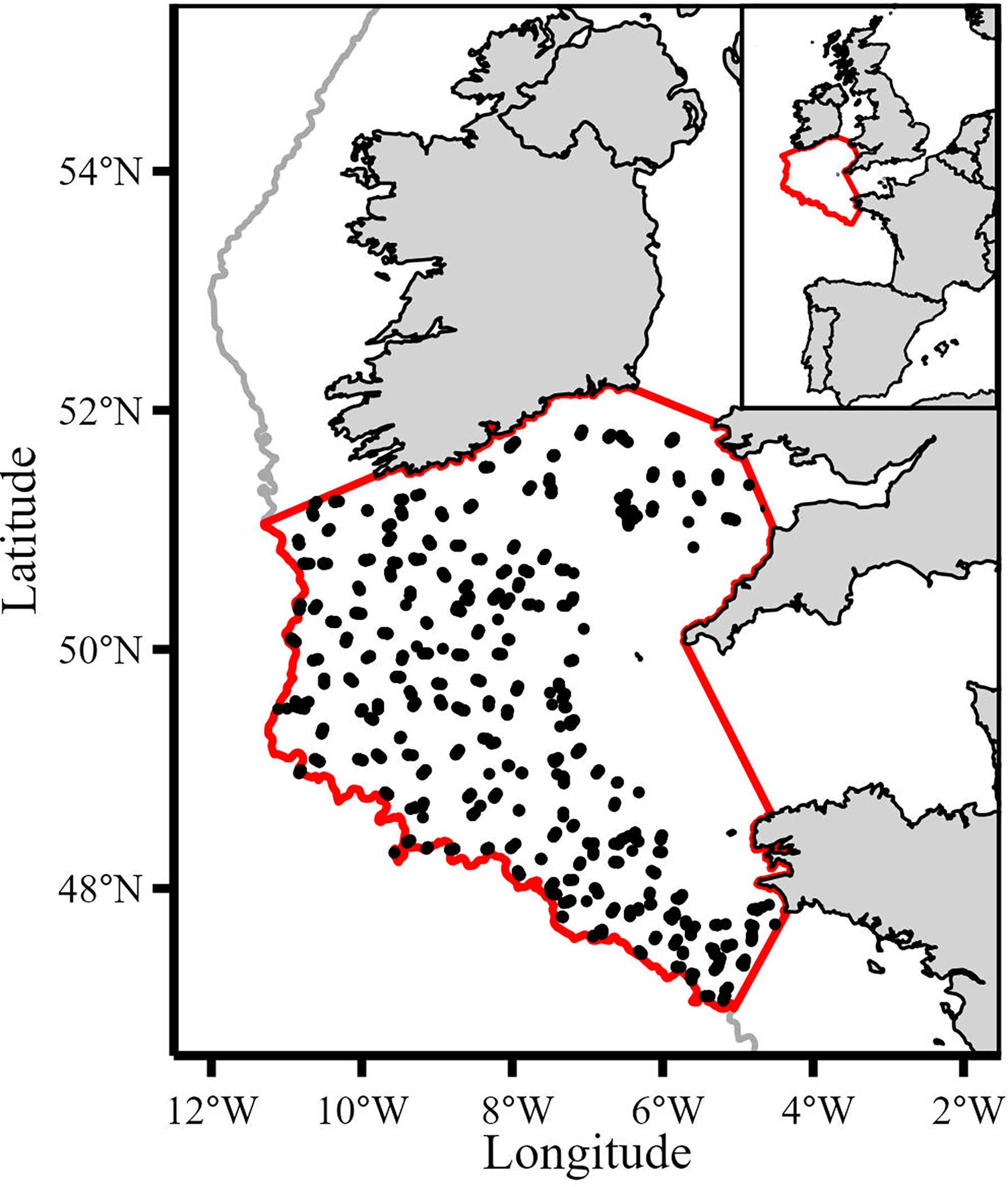 Map of study area (bounded by the red line) and the 1534 IBTS haul locations used (black points). Grey line denotes 200m isobath.