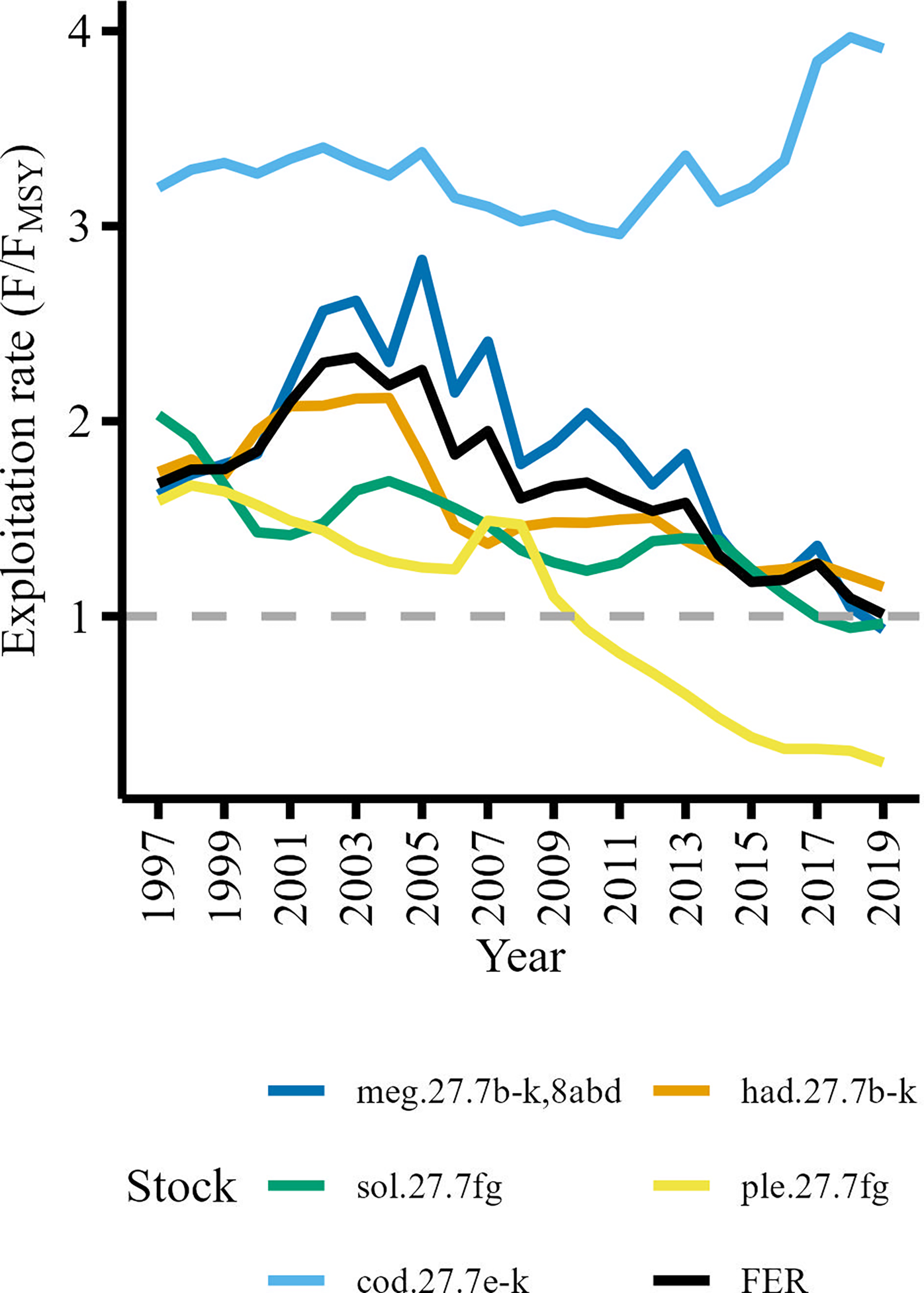 Fishing exploitation rates of commercially important Celtic Sea demersal stocks. The mean fishing exploitation rate (FER) represented by the black line is the catch weighted mean of haddock (had.27.7b-k), megrim (meg.27.7b-k8abd), plaice (ple.27.7fg), and sole (sol.27.7fg) exploitation rates. The grey dashed line delineates the upper threshold for a sustainably exploited stock (F/FMSY ≤ 1).