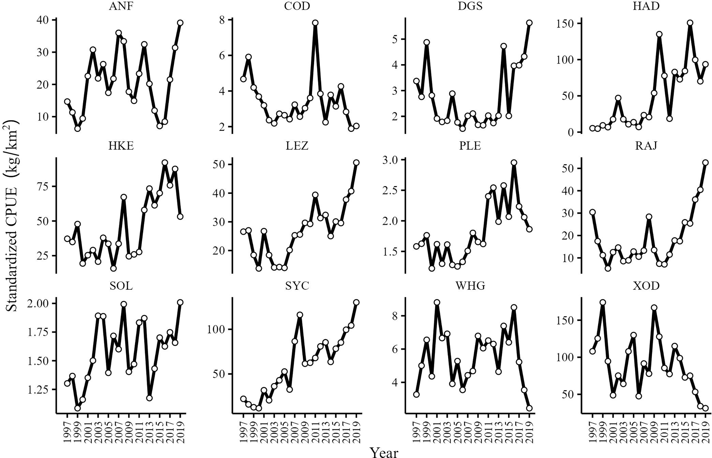 CPUE (kg/km2) series of anglerfish (ANF), cod (COD), spurdog (DGS), haddock (HAD), hake (HAK), megrim spp. (LEZ), plaice (PLE), skates and rays (RAJ), sole (SOL), lesser-spotted dogfish (SYC), whiting (WHG) and Trisopterus spp. (XOD) in the Celtic Sea from 1997 to 2019.