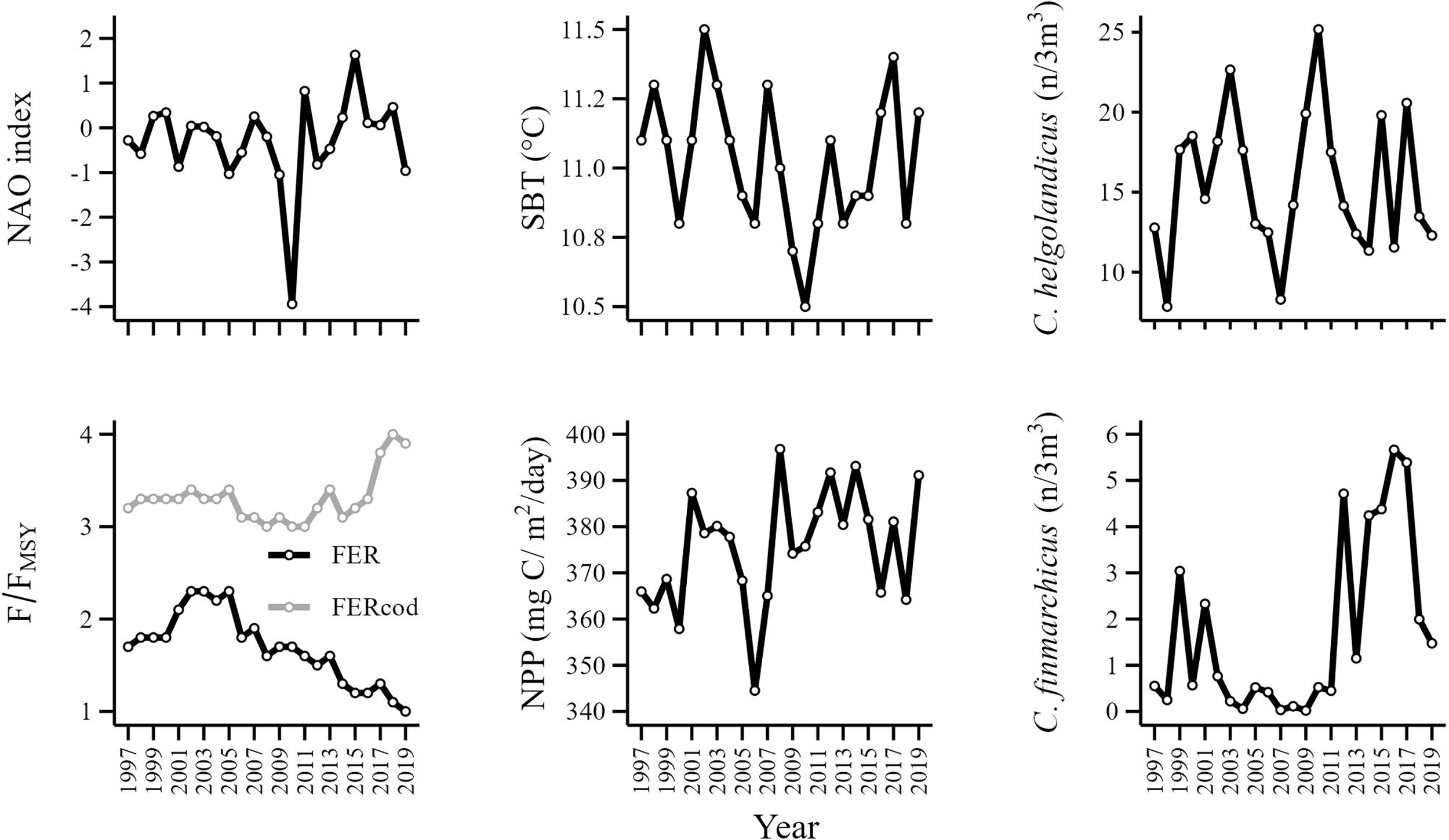 Time series of explanatory variables. Catch weighted mean fishing exploitation rate (FER), cod exploitation rate (FERcod), North Atlantic Oscillation index (NAO), net primary production (NPP), sea bottom temperature (SBT) and the relative abundance of C. finmarchicus (FIN) and C. helgolandicus (HEL).