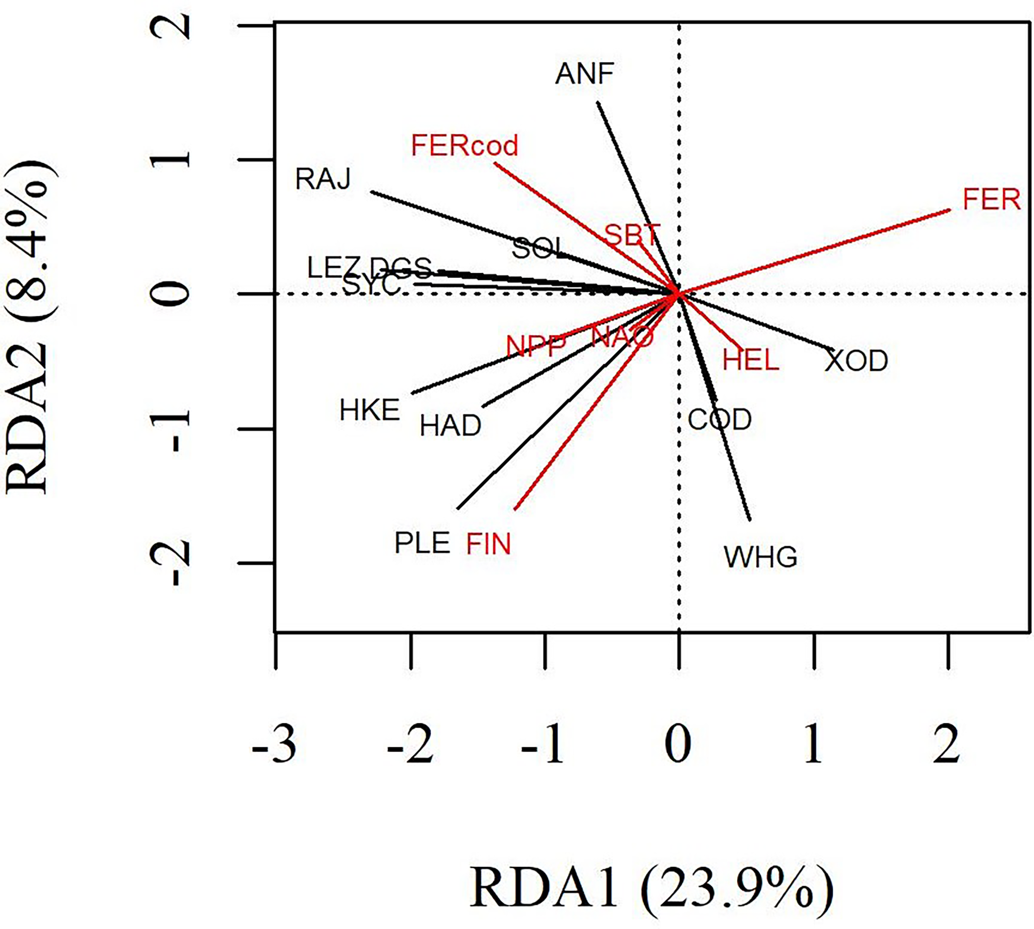 RDA correlation triplot of CPUE series (black) constrained by explanatory variables (red). The direction and orthogonality between vectors and ordination axes indicate the direction and strength of the linear correlations.