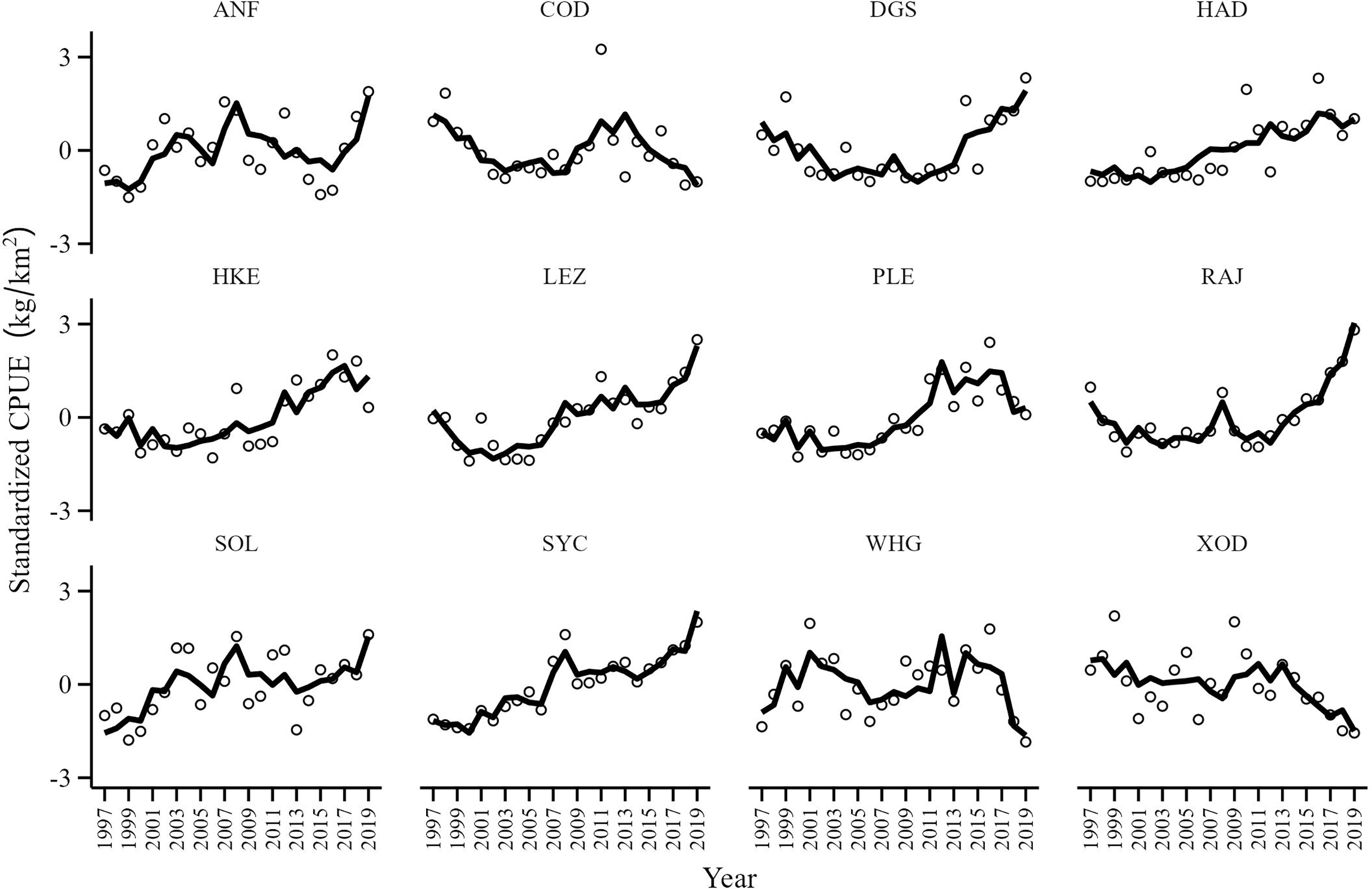 CPUE series were characterized by interannual variability with several CPUE series showing similar trends (Figure 3). The CPUE of spurdog (DGS), haddock (HAD), hake (HKE), megrim (LEZ), plaice (PLE), the skates and rays (RAJ) and lesser-spotted dogfish (SYC) increased since 1997, particularly in the last decade. Cod (COD), whiting (WHG) and Trisopterus spp. (XOD) CPUE series remained relatively stable although there appears to be a period of decline since 2015. The CPUE of anglerfish (ANF) and sole (SOL) showed periodic fluctuations although the tendency is towards an increasing CPUE for the study period.