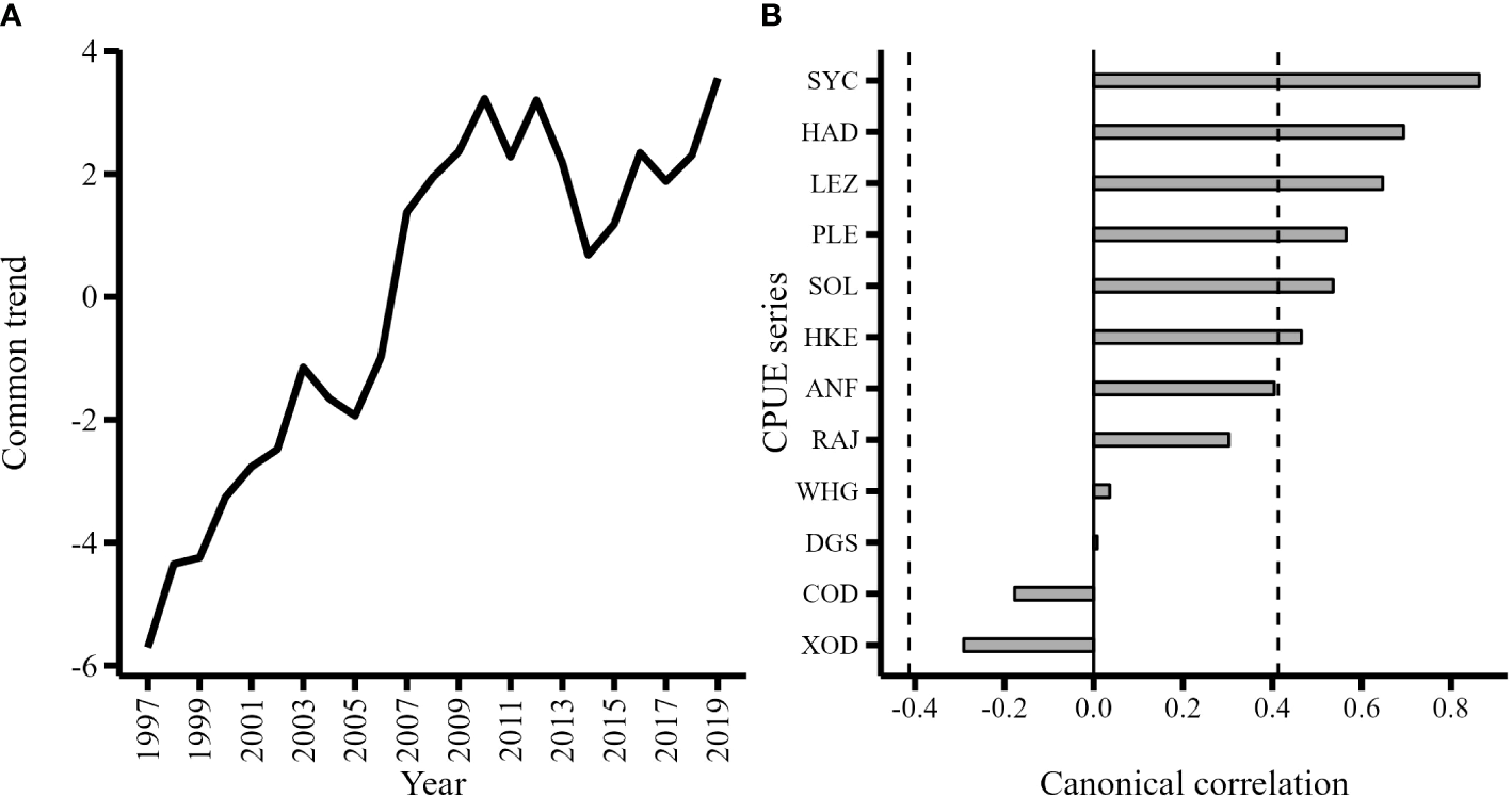 The dataset was spatially subset to the study area resulting in 1534 valid hauls from 1997 to 2019. Biomass (kg) was calculated by summing the weight across all length classes for each taxon in each haul. Swept area (km2) was calculated by multiplying wing spread by haul distance for each haul. To calculate annual CPUE values we used the geometric mean because it is scale invariant and less sensitive to outliers (Fraser et al., 2007; Campbell, 2015; Sala, 2018). Catch composition varied between hauls with some observations containing zero values so we added an offset of one to all values to calculate the geometric mean. This offset had no impact on the dataset because this study investigated trends in the index of relative abundance (CPUE) and not absolute values. Annualized CPUE series were expressed as biomass per swept area (kg per km2). Several species in the Celtic Sea are managed under a single Total Allowable Catch (TAC). For example, black-bellied anglerfish (Lophius budegessa) and white anglerfish (Lophius piscatorius) are managed under a combined TAC. We combined the CPUE of species that are managed under combined TAC based on the assumption that changes in exploitative patterns imposed on species with combined TACs would manifest as signals in the combined CPUE. CPUEs represented by several species/stocks were anglerfish (ANF; Lophius piscatorius, L. budegassa), megrim (LEZ; Lepidorhombus whiffiagonis and L. boscii) and skates and rays (RAJ; Dipturus batis, Leucoraja naevus, Raja montagui, Raja clavata, Raja microocellata, Raja brachyura and Leucoraja fullonica). The CPUE at the species level were cod (COD; Gadus morhua), haddock (HAD; Melanogrammus aeglefinus), whiting (WHG: Merlangius merlangus), hake (HKE; Merluccius merluccius), lesser-spotted dogfish (SYC; Scyliorhinus canicula), sole (SOL; Solea solea), plaice (PLE; Pleuronectes platessa) and spurdog (DGS; Squalus acanthias). Although not managed or commercially exploited, Trisopterus spp. are important prey for higher trophic levels (Crozier, 1985; Trenkel et al., 2005; Gosch et al., 2014) so we combined Trisopterus minutus, T. esmarkii and T. luscus into a combined CPUE (XOD). The IBTS survey did not operate in the Celtic Sea in 2017 due to mechanical failure so the missing time points in 2017 were interpolated using a centered 5-year moving average for each CPUE series.