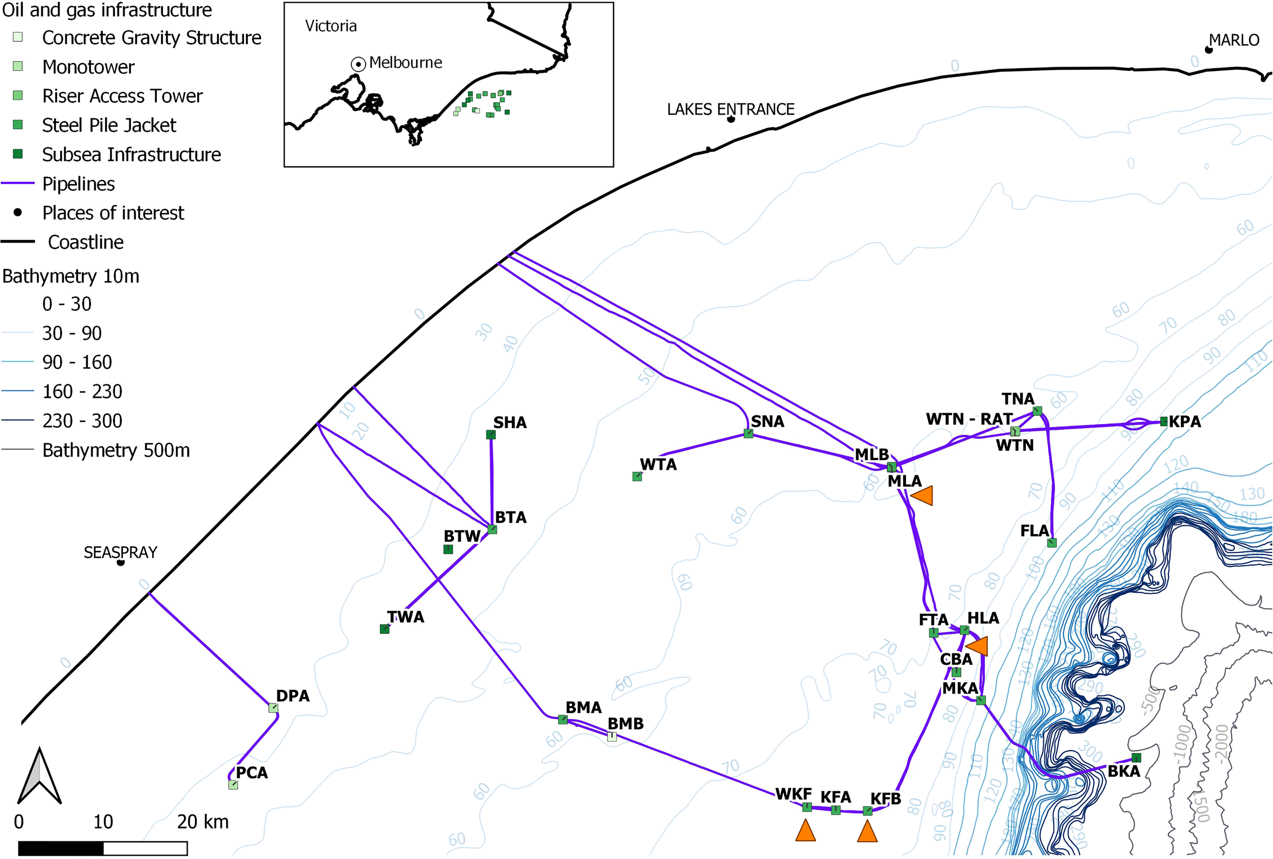 Map of Esso Australia Resources Pty Ltd (EARPL)-operated oil and gas structures in the Gippsland Basin of the Bass Strait region, south-east Australia. An inset map shows the location of the structures along the coastline east of Melbourne in the state of Victoria. Each platform is identified with the structure type. The platforms and pipelines included in this study are indicated by the orange triangles. Map created in QGIS.