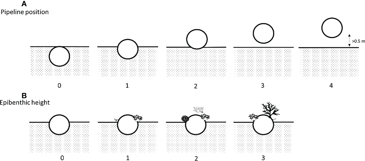 (A) Method of assessing pipeline position with 0: buried; 1: more than half buried; 2: resting on the seafloor; 3: span< 0.5 m; and 4: span > 0.5 m and (B) epibenthic height with 0: negligible; 1: low (0 – 20 cm); 2: medium (20 – 40 cm); and 3: high (> 40 cm). A version of this figure has previously been published in McLean et al., 2020b.