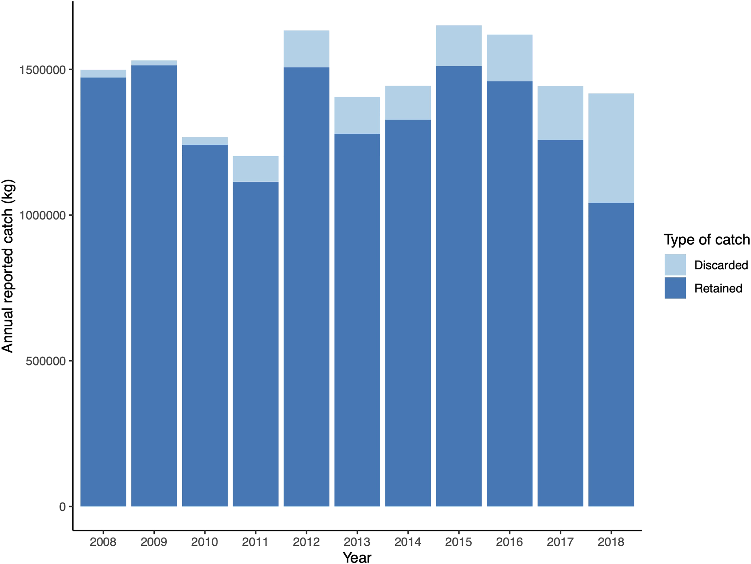 Cumulative retained and discarded catch was summed annually to understand the intensity of fishing effort over the ten-year period. The retained catch over ten years was summed for the 12 most abundantly caught families. Cumulative catch of the most important 30 fishery species or species groups was also summarized.