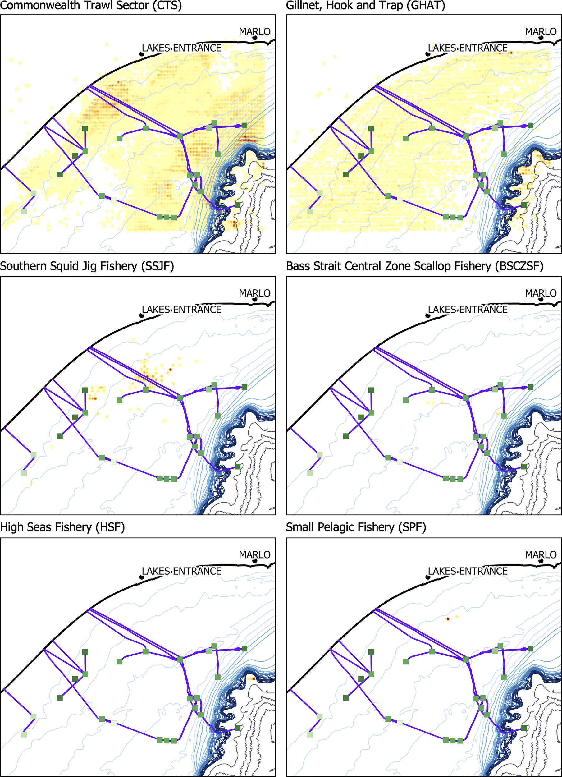 Spatial distribution of fishing effort for six Commonwealth fisheries among the offshore oil and gas structures in the Gippsland Basin. Maps were made in QGIS. Individual versions of these maps with accompanying legends are included in the Supplementary Materials.