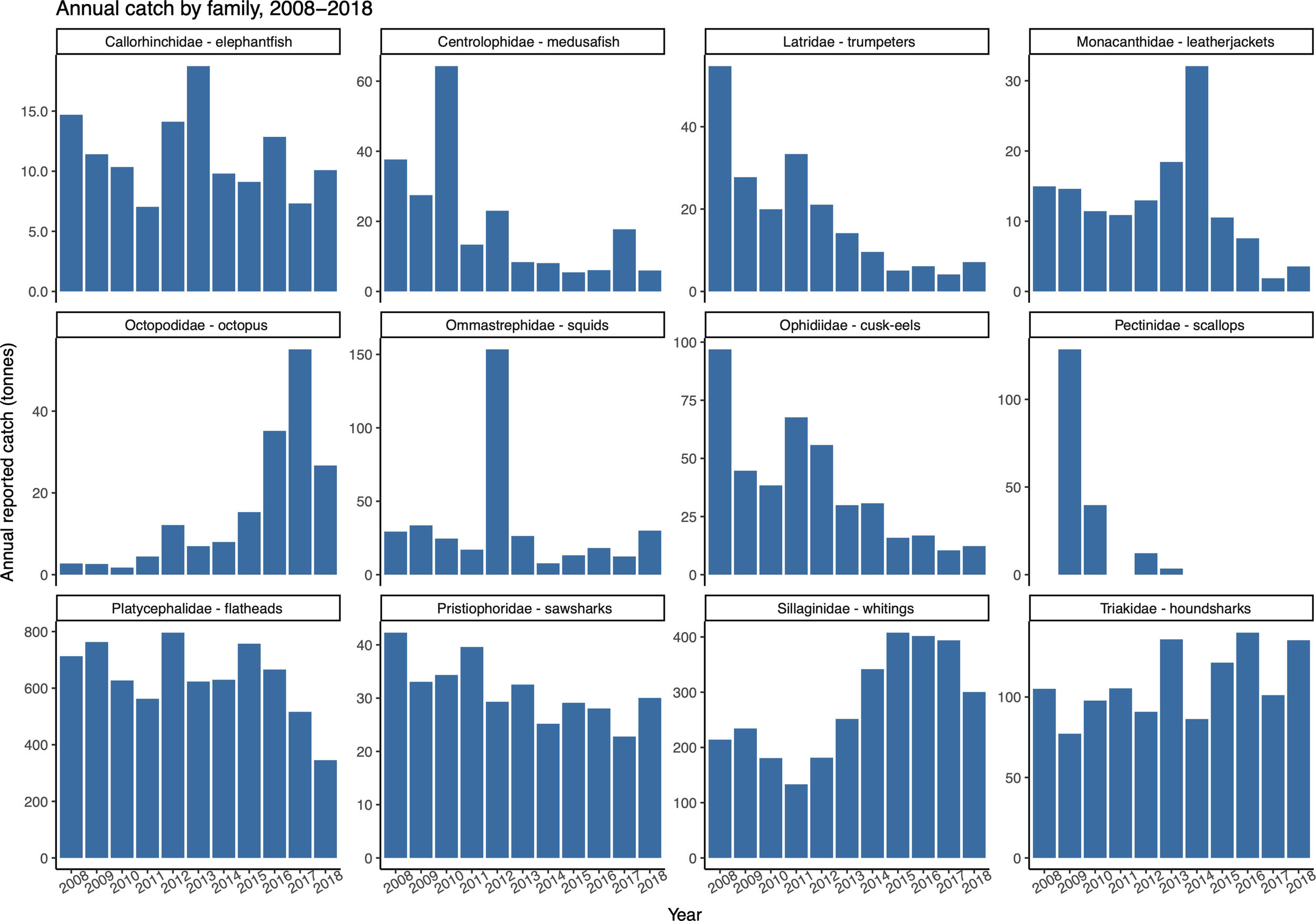 Species composition from reported catch was quite diverse, with 248 species or species groups reported from 110 families of fishes and invertebrates. It is important to note that this is an underestimate of true species diversity as many species are reported to family or order. Ninety-nine of these species/groups were rarely caught, being reported fewer than ten times in ten years. The most frequently retained species (in terms of cumulative catch weight) were from the following families (Figure 4): Platycephalidae (flatheads), Sillaginidae (whitings), Triakidae (houndsharks), Ophidiidae (cusk-eels), Ommastrephidae (squids), Pristiophoridae (sawsharks), Centrolophidae (medusafish), Latridae (trumpeters), Pectinidae (scallop), and Octopodidae (octopus). Other commercially important families include Monacanthidae (leatherjackets), Callorhinchidae (elephantfish), Zeidae (true dories), and Mullidae (goatfishes) with all other families contributing less than 100,000 kg over the ten-year period. The category “Mixed Fish” is a frequent allocation for any species not caught in high abundance per deployment of fishing gear. This could represent any number of species caught in smaller quantities and comprised a substantial portion of the fishery catch over time.