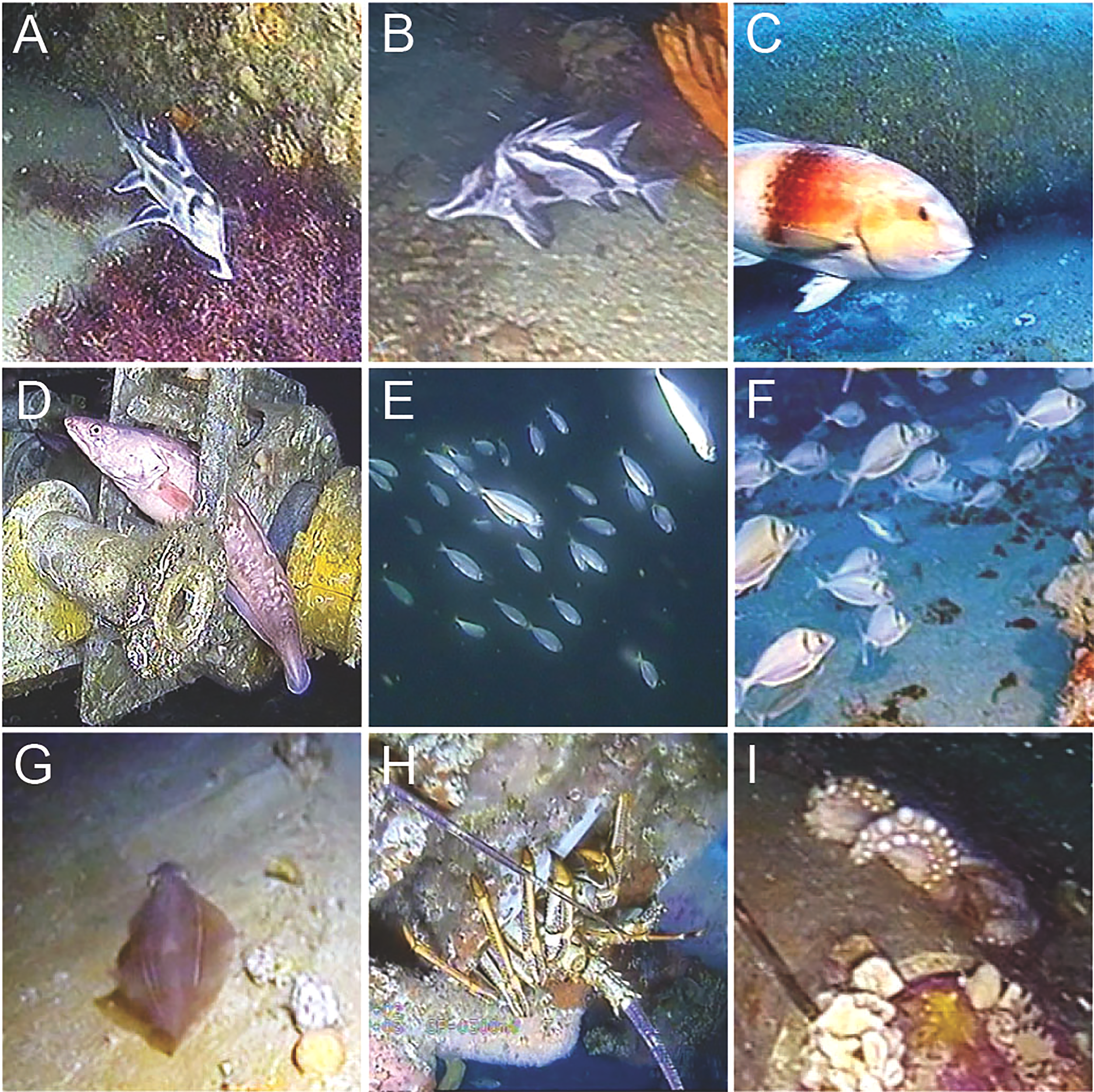 Examples of fishery species observed during industry-collected ROV surveys: (A) elephantfish, Callorhinchus milii, (B) longsnout boarfish, Pentaceropsis recurvirostris(C) bluethroat wrasse, Notolabrus tetricus, (D) pink ling, Genypterus blacodes, (E) jack mackerels, Trachurus spp., (F) jackass morwong, Nemadactylus macropterus, (G) squid, (H) southern rock lobster, Jasus edwardsii, and (I) an octopus.