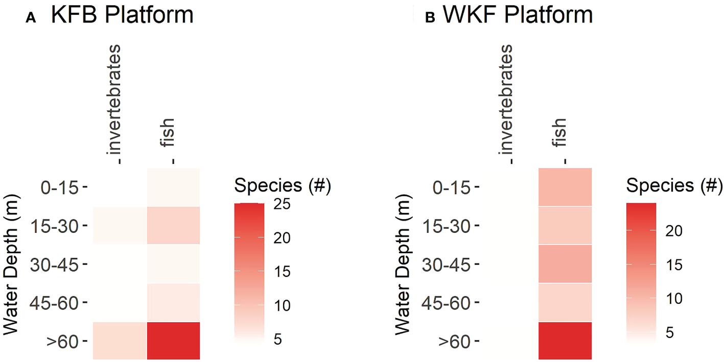 To test for the influence of depth on marine communities, we divided each jacket into five water column depth bands (0 – 15, 15 – 30, 30 – 45, 45 – 60, > 60 m; Supplementary Figure 1) covering the underwater span of these structures. A selection of five to seven replicate videos was then used to survey marine life associated with each of these depth bands at both platforms (Supplementary Table 1). Videos ranged in length from 1 to 21 minutes with those selected for analysis having good visibility, a field of view adequate for counting fish and benthos, and slow movement of the ROV.