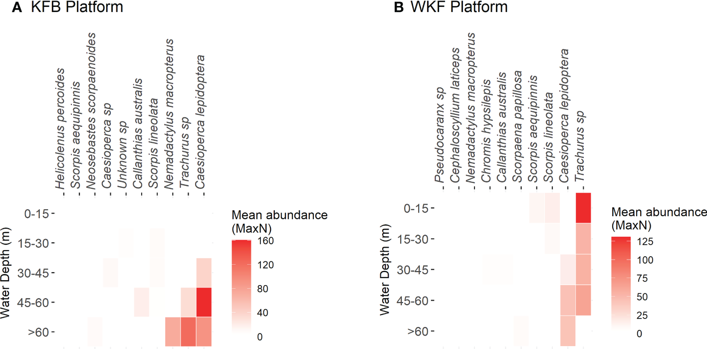 At KFB, 43 species were recorded (34 species of fish, eight invertebrates and one mammal), and 46 at WKF (39 species of fish, six invertebrates, one mammal). Of the 67 species recorded across both platforms, only 22 species were observed at both platforms, while 21 were unique to KFB and 24 unique to WKF. Additional species included the world’s largest bony fish, the sunfish (Mola spp.). Fish species that were common on both platforms were also abundant at each platform (e.g., C. lepidoptera, N. macropterus, Table 1). Other fish species were unique to WKF (e.g., Trachurus spp., Pseudocaranx spp.).