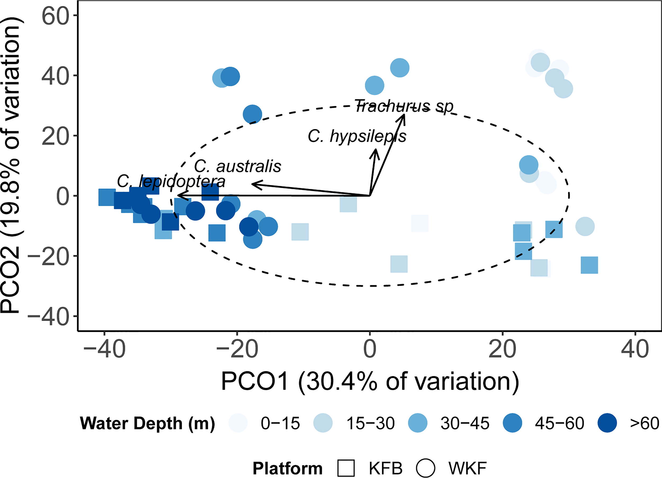 To further test for differences in fish community composition between platforms and depth bands, multivariate ordination plots via Principal Coordinates Analysis (PCO; Anderson et al., 2008) were constructed. PCO analysis was based on a Bray-Curtis similarity matrix, generated from fourth-root transformed data on individual fish species abundance. Arrows representing species with significant correlation (|R| ≥ 0.4) with the PCO axes, were then overlaid on the PCO (Anderson et al., 2008).