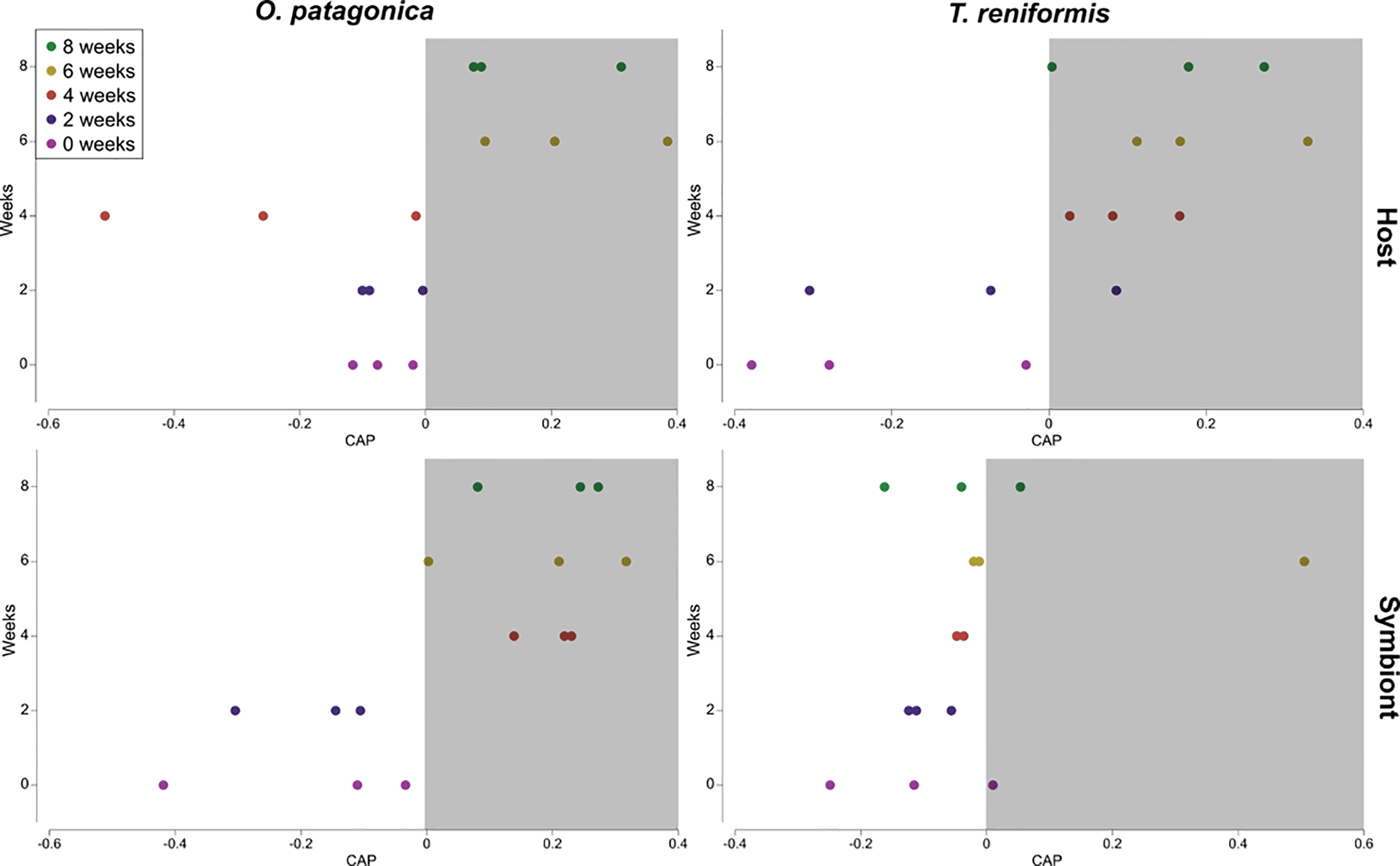 Figure 3 Canonical analysis of principal coordinates (CAP) plot performed using Euclidean distance matrix of the δ15N values of the amino acids (alanine, glycine, serine, proline, aspartic-acid, glutamic-acid, valine, leucine, isoleucine, threonine, methionine, and phenylalanine) of the host and symbiont compartments of the corals O. patagonica and T. reniformis over 8 weeks incubation in the dark. Weeks in the white area significantly differ from weeks in the grey area. However, if weeks are overlapping between white and grey areas, they are not different.