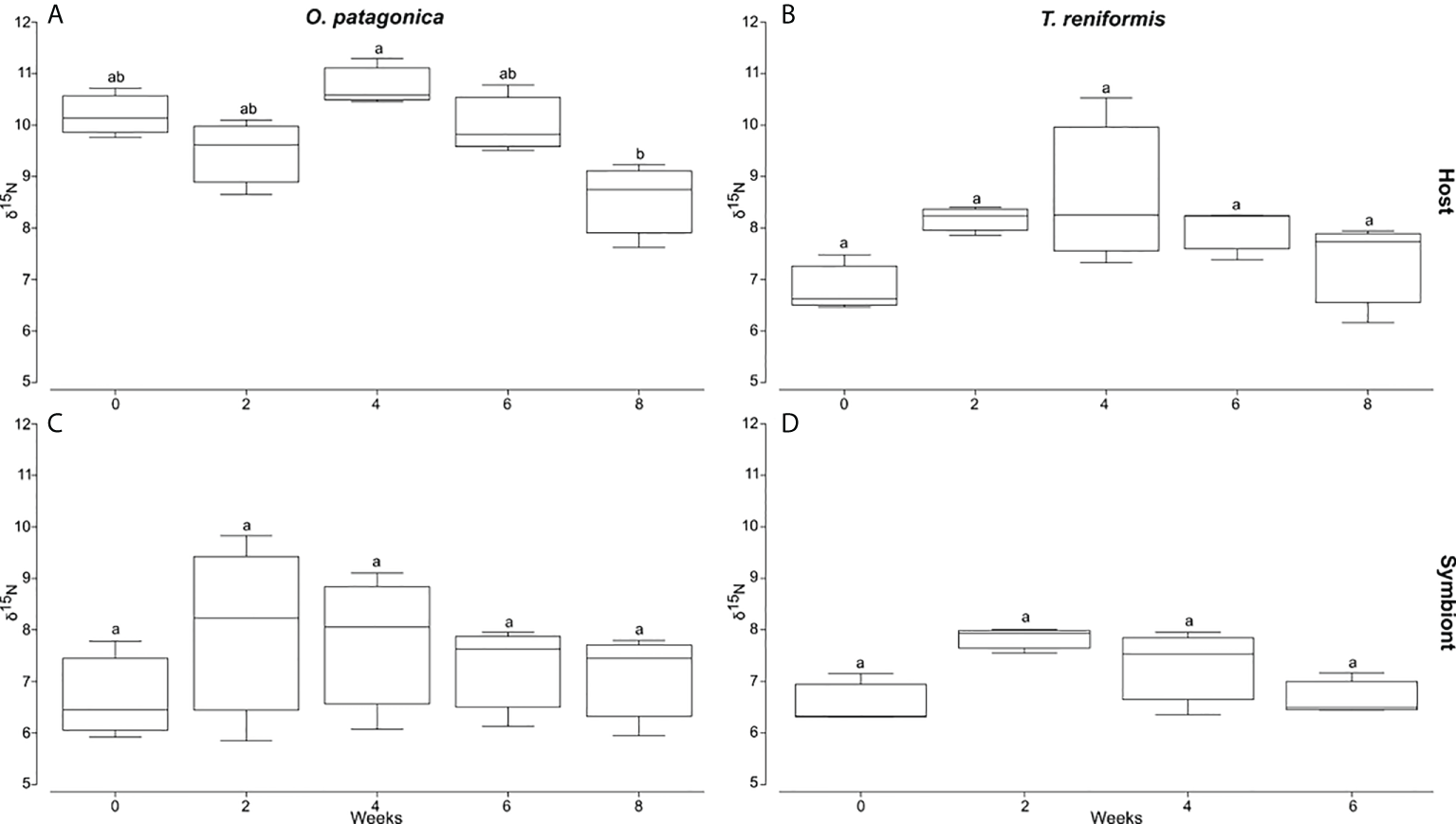 Figure 5 Bulk δ15N values of the host tissue and symbionts of O. patagonica and T. reniformis over 8 week incubation in the dark. (A) and (B) are O. patagonica and T. reniformis host tissue. (C) and (D) are O. patagonica and T. reniformis symbionts. Significant differences between weeks are represented by different let.