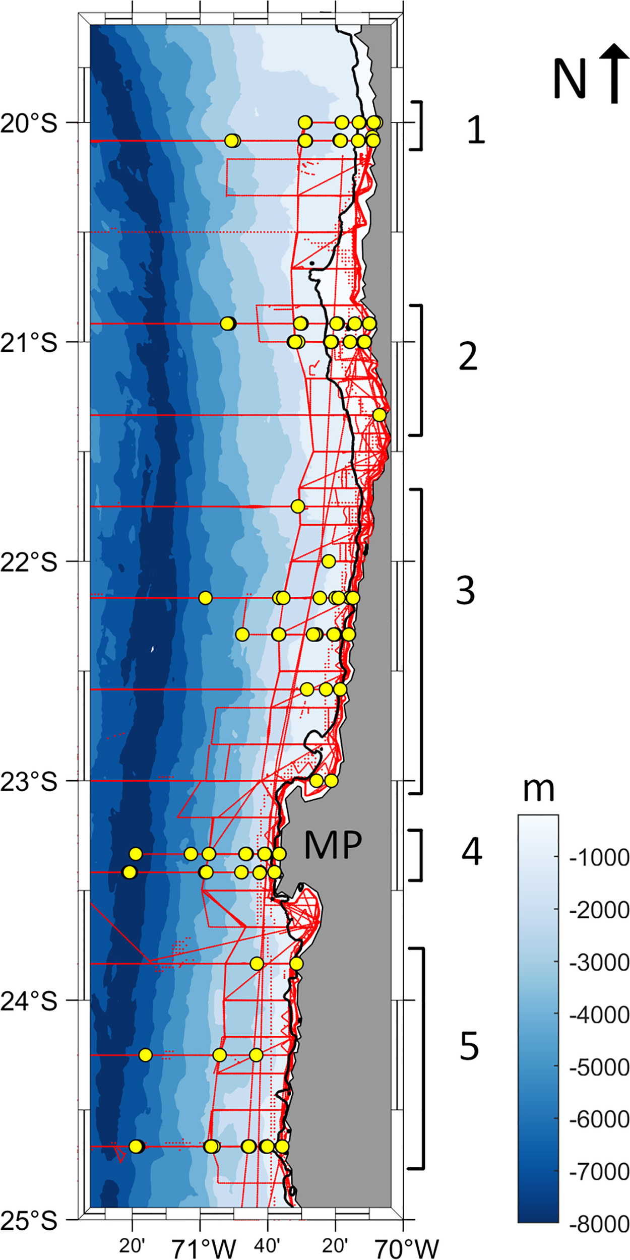 Map of the study area showing the bathymetry (color coded) and 200 m isobath as a black line. Yellow dots represent the zooplankton and CTD-O sampling stations. Red dots (seen as red lines because of the high spatial resolution of the data) represent the anchovy acoustic sampling records. Samples were grouped in 5 latitudinal groups (numbers 1-5, defined in the text).