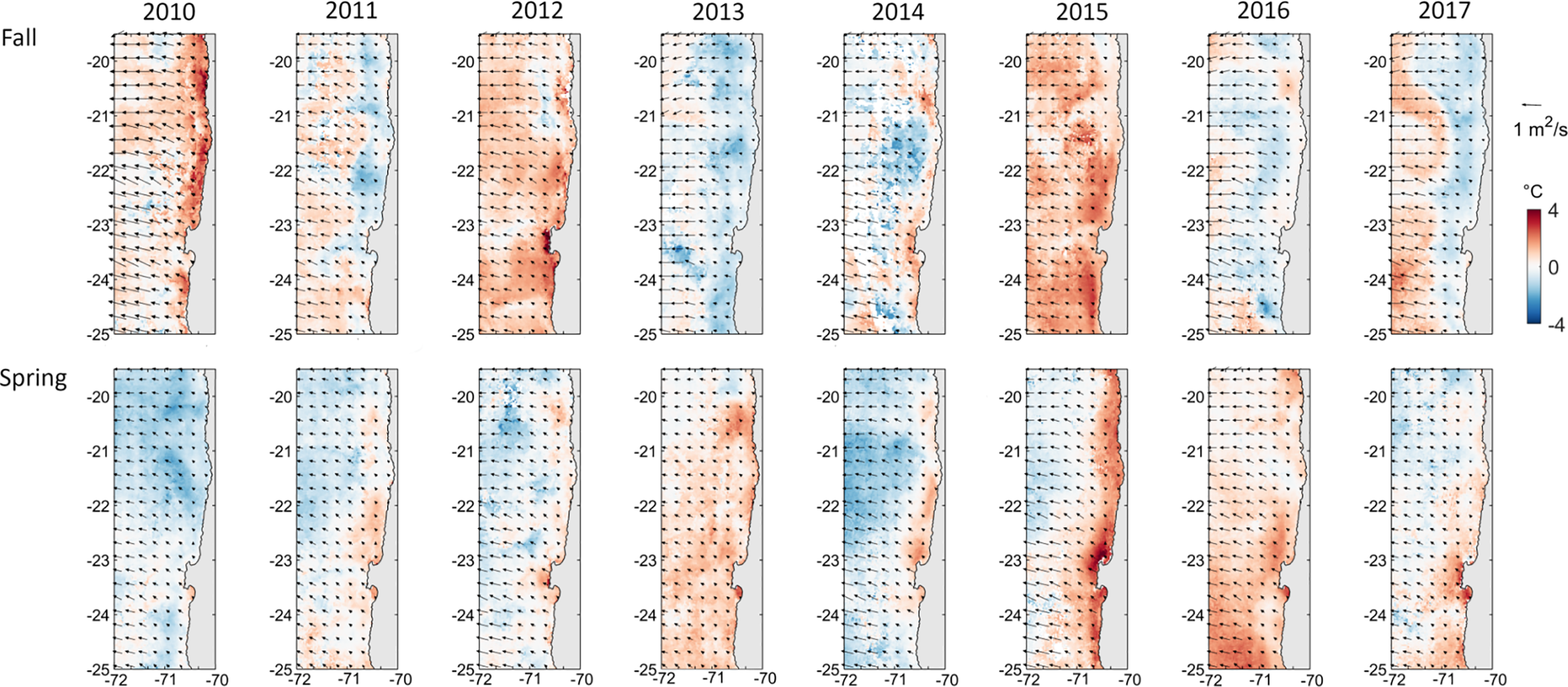 Monthly SST anomalies (°C) of every April (representative of fall, upper panels) and December (representative of spring, lower panels). The vectors correspond to the mean Ekman transport vectors (m2 s-1).