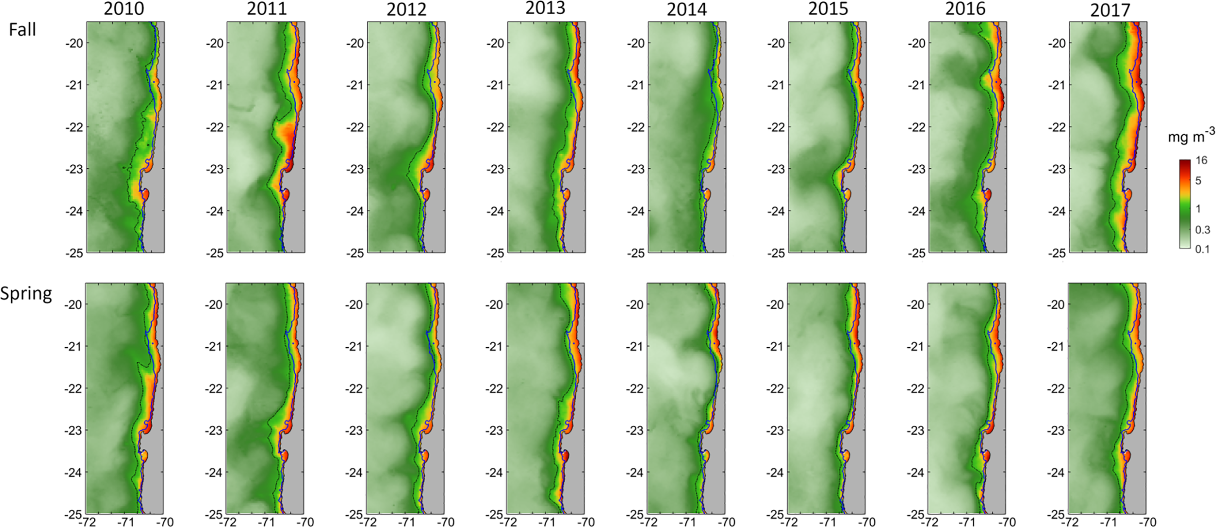Monthly mean satellite chlorophyll-a (mg m-3) of every April (representative of fall, upper panels) and December (representative of spring, lower panels). The black dotted line indicates the 1 mg m-3 isoline, whereas the blue line indicates the 200 m isobath.