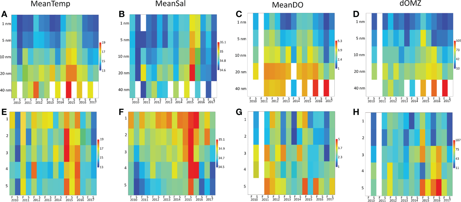 Heatmaps of CTD-O derived variables across sampling periods and as a function of distance from the coast (A–D) and latitudinal group (E–H). F, fall survey; S, spring survey.
