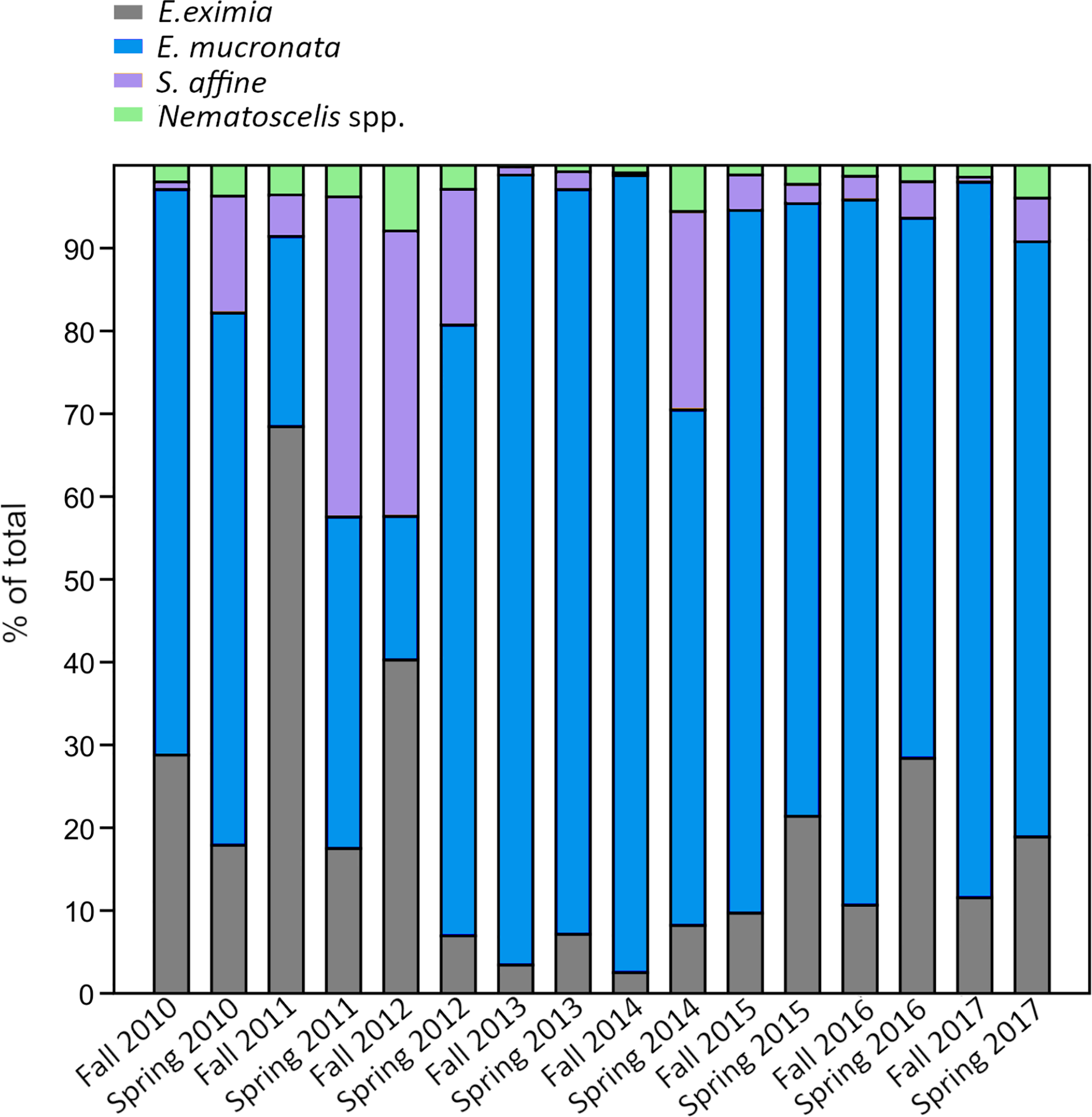 Out of the 4 taxa that dominated the community, Humboldt krill was the most abundant (1222 ± 2312 ind. 1000 m-3) and accounted for 73% of the total abundance, followed by E. eximia (15%, 236 ± 631 ind. 1000 m-3), S. affine (9%, 181 ± 487 ind. 1000 m-3) and Nematoscelis spp. (3%, 46 ± 109 ind. 1000 m-3). Taxa contributions to total abundance showed large fluctuations among sampling periods (Figure 5). E. mucronata accounted for 17% (spring of 2012) to 96% (fall of 2014) of the total abundance, while the highest contribution of E. eximia (68%), S. affine (39%), and Nematoscelis spp. (8%) was observed during the fall of 2011, spring of 2011 and fall of 2012, respectively. E. mucronata was negatively correlated to the abundance of S. affine (ρ=-0.31, p<0.001) and Nematoscelis spp. (ρ=-0.18, p=0.03), while E. eximia was positively related to the same taxa (ρ=0.33, p<0.001 and ρ=0.58, p<0.001, respectively).