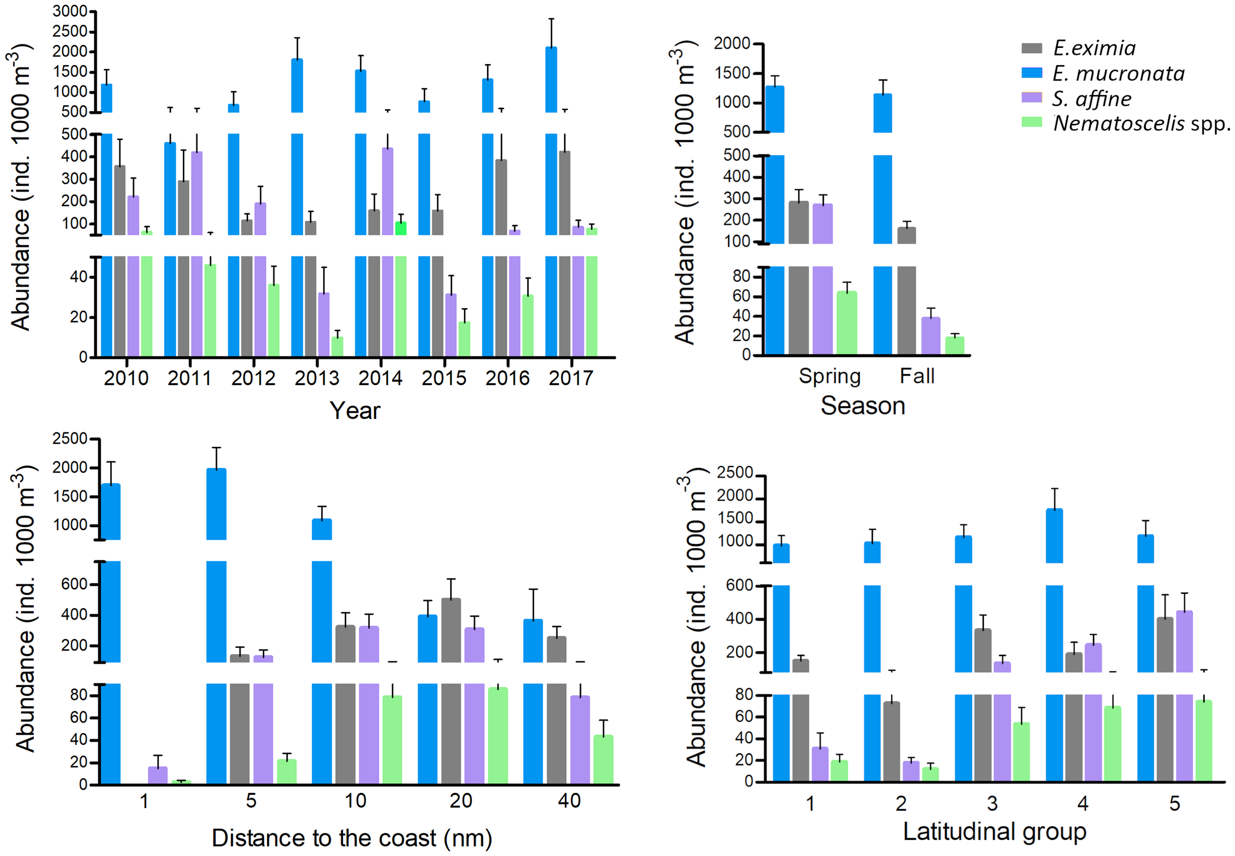Interannual, seasonal, longitudinal (distance from the coast) and latitudinal (latitudinal groups as defined in the Methods section) variability in mean abundances (ind. 1000 m-3) and standard error, of the 4 most abundant taxa.