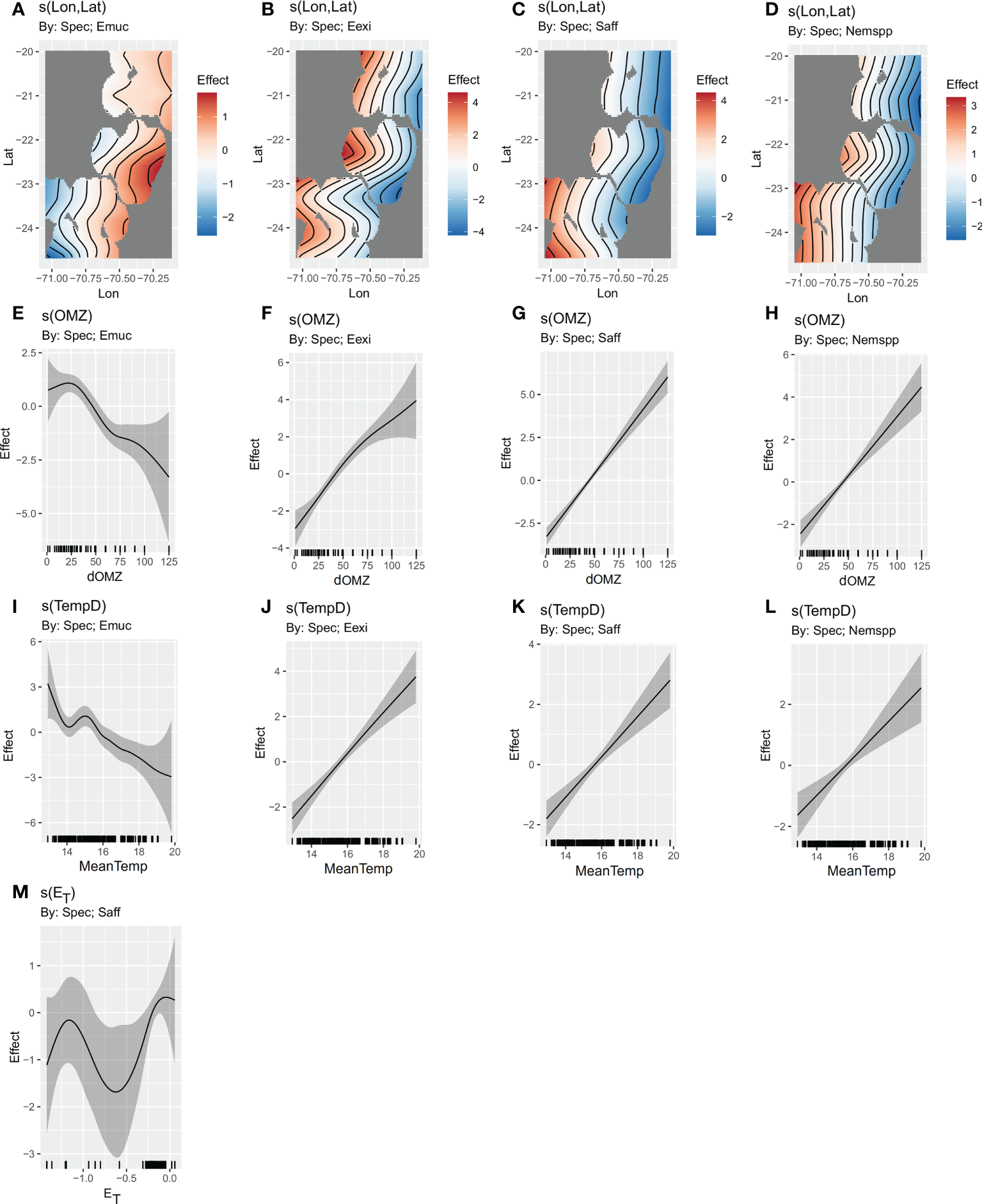 HGAM models, showing function smooths with 95% confidence bands of the selected covariates, in different models. (A–D) Spatial model, (E–H) dOMZ model, (I–L) MeanTemp model, and (M) effect of ET from final model. Only significant terms are shown. Emuc, E. mucronata, Eexi, E. eximia, Saff, S. affine, and Nemspp, Nematoscellis spp.