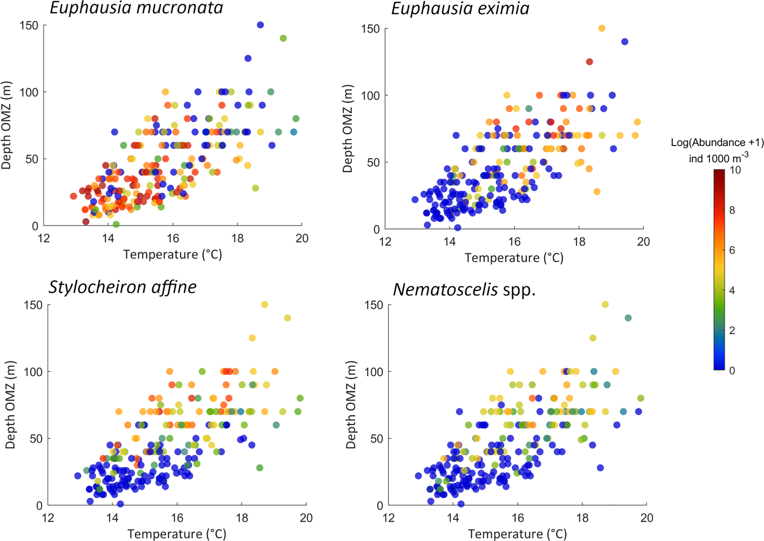 MeanTemp/dOMZ diagrams with observed abundances (ind. m-3) superimposed.