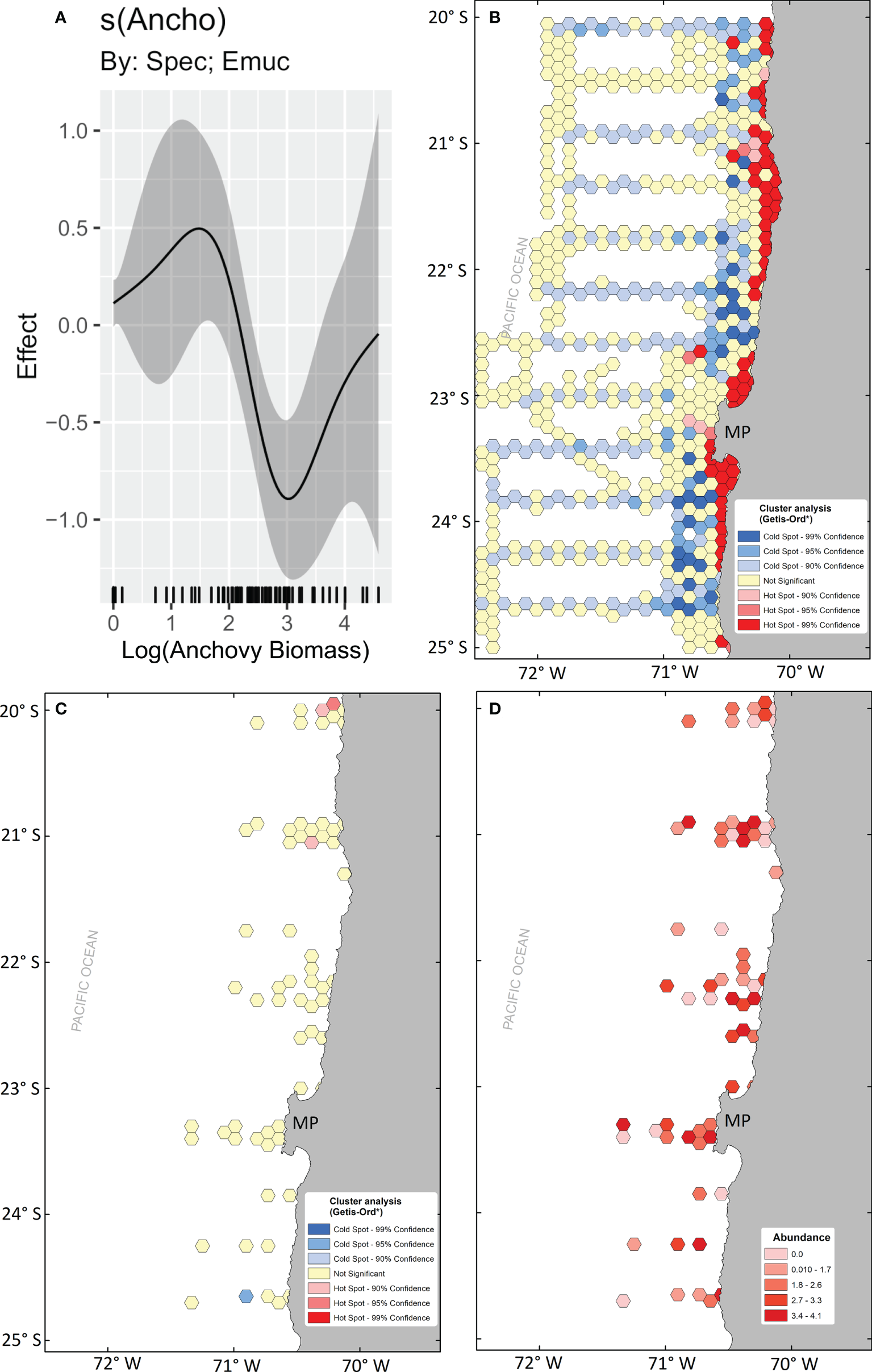 Effect of anchovy biomass (m2 nm-2) on E mucronata abundances (smooth function obtained from the HGAM final model) (A), Getis-Ord local Gi* cluster analysis for anchovy (B), and E mucronata(C), and mean abundance map of E mucronata(D).