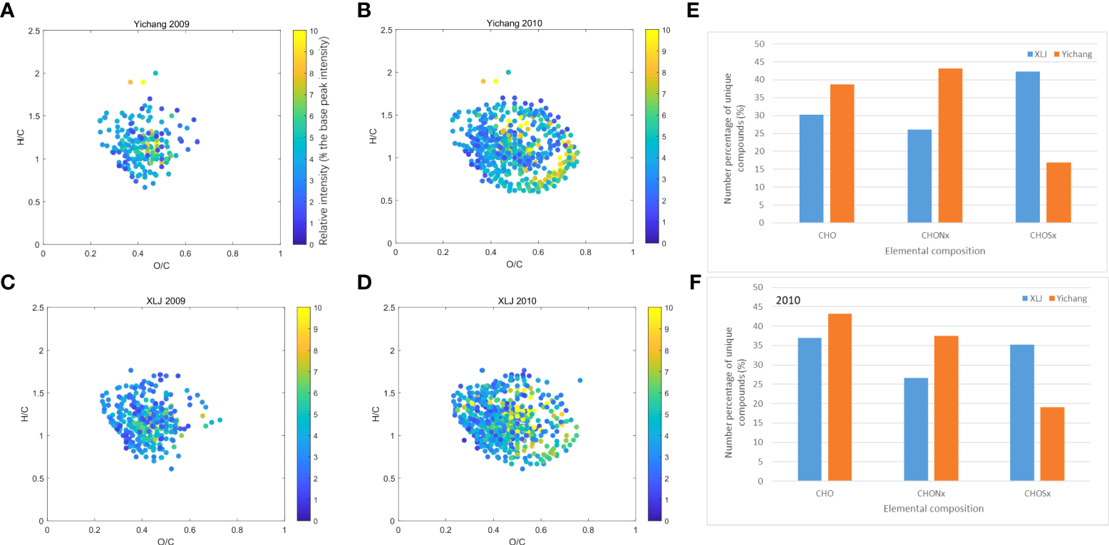 (A–D), van Krevelen diagrams of unique formulas from two stations Yichang (YC) and Xuliujing (XLJ). The color bar represents the relative intensity of each formula; (E, F) Comparison of number percentage of unique compounds for each of the two stations.