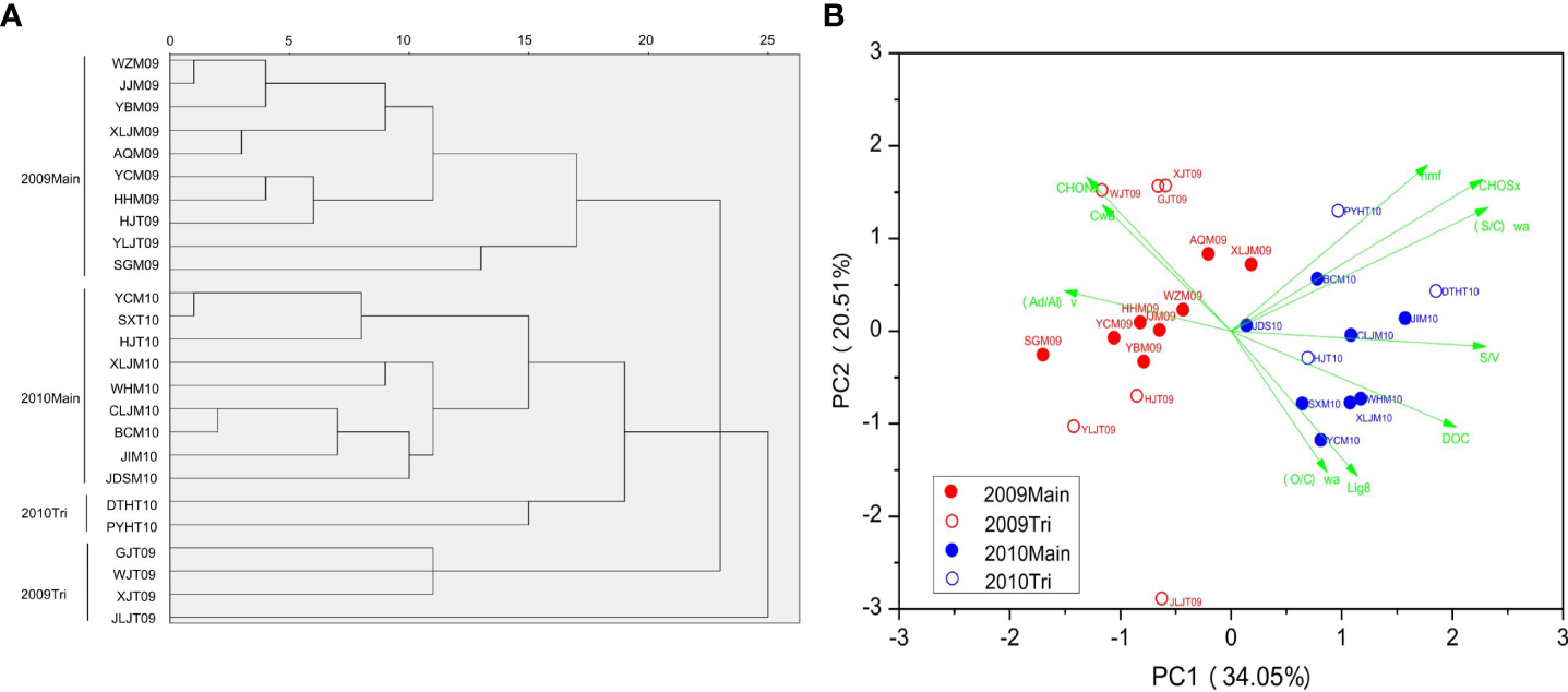 Agricultural activities (e.g. paddy field) dominate in the middle and lower reaches of the Changjiang. It is an ideal scenario to evaluate the potential influence of paddy soils on riverine DOM (Li et al., 2018a). In addition, rapid economic development and urbanization are unavoidable processes within the watershed. It has been previously suggested that land-use is one of the main drivers for the reactivity and molecular composition of riverine DOM (Li et al., 2018b). When we compare the signature of DOM collected from tributaries and main stream, especially by the elemental formulas, they were well separated illustrated by cluster analysis (Figure 3A). PCA analysis showed similar results, even when combined with bulk chemical properties (Figure 3B). The samples collected from lake systems, northern and southern tributaries were well separated from the two batches of main stream samples. The 2009 main stream samples had high positive PC1 scores and those from 2010 had high negative PC2 scores (Figure 3B).