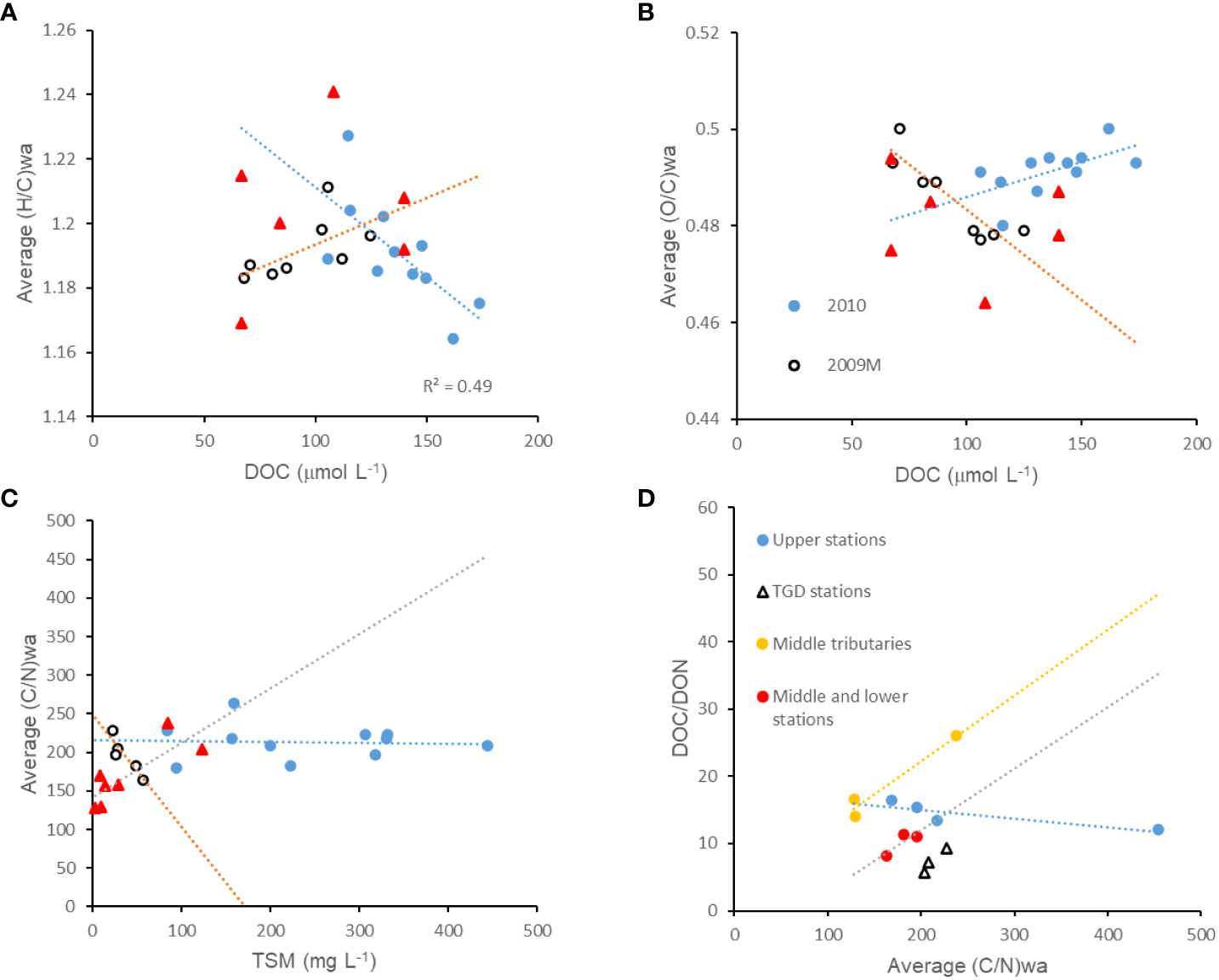 Linear correlations of bulk parameters with elemental proxies subdivided into various sample groups. (A): DOC vs (H/C)wa; (B): DOC vs (O/C)wa; (C): TSM vs (C/N)wa; (D): DOC/DON vs (C/N)wa.