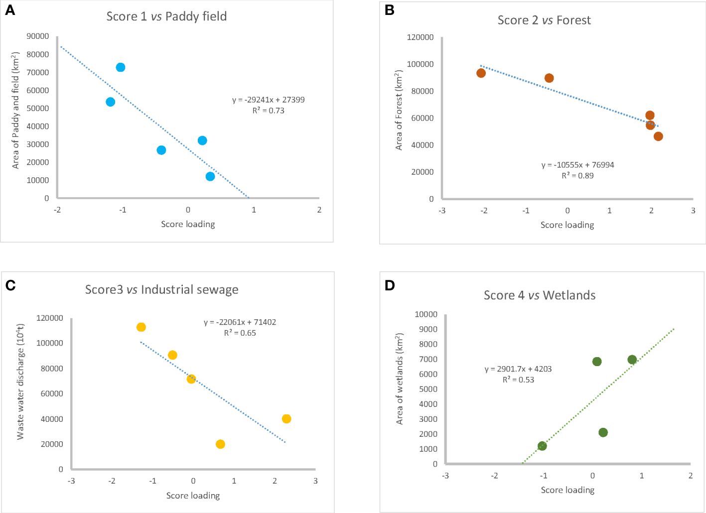 Correlation of PCA loadings of molecular structures with land use/anthropogenic input information in various tributaries, (A): Paddy field; (B): Forest; (C): Industrial waste water;-(D): Wetlands.