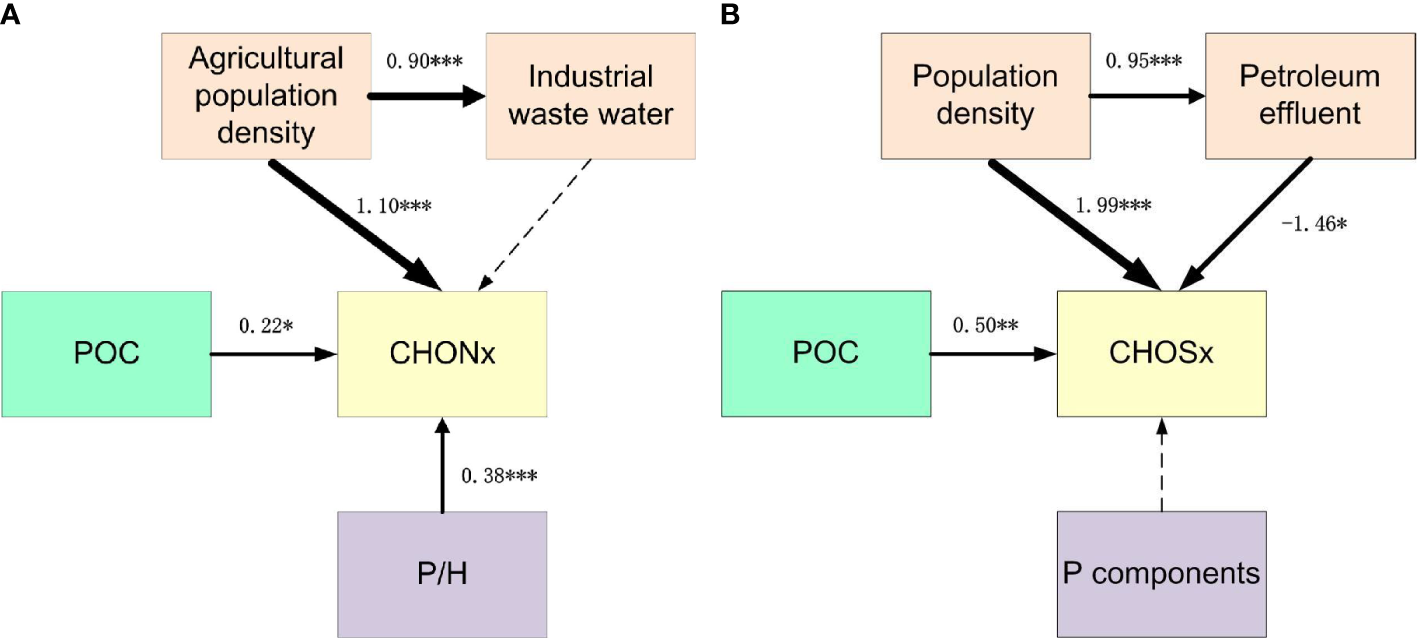 Path analysis is used to evaluate causal models by examining the relationships between a dependent variable and two or more independent variables. It differentiates between correlation and causation by partitioning simple correlation coefficients between independent and dependent variables into direct and indirect effects (Du et al., 2021). Path analysis provides a numerical value for both direct and indirect effects, thus indicating the relative strength of causal relationships. Here, we conduct path analyses using the likelihood estimation method with IBM SPSS AMOS. A comparative fit index (CFI) value of > 0.9 and a root mean square error of approximation (RMSEA) of< 0.1 indicated that the path model fitted well with the data. In our models, there are not latent variables, but endogenous and exogenous variables. In the CHONx compound model, CHONx and industrial waste water are the endogenous variables. Information on agricultural population density, industrial sewage, POC and P/H are the exogenous variables. For the CHOSx compound model, population density, petroleum effluent, POC and protein-like components were involved are exogenous variables, petroleum effluent and CHOSx are the endogenous variables (Table S3).