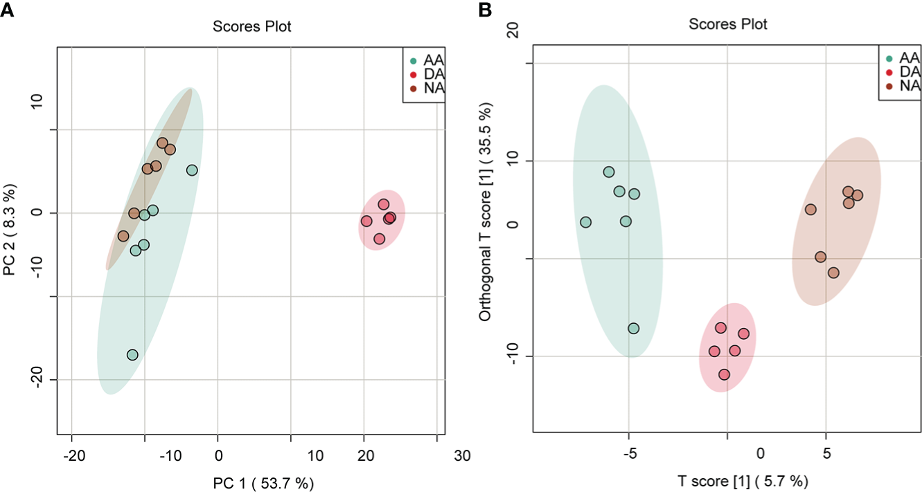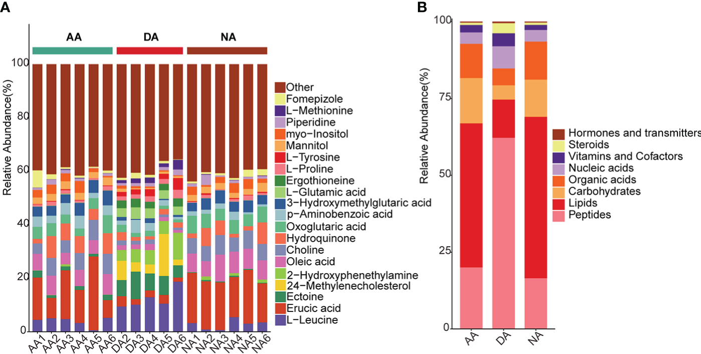 Six individuals for NA group, six individuals for AA group and five individuals for DA group were used for metabolomics analysis. Each sample (~100 mg) was accurately weighed, and 0.6 mL precooled 2-chlorophenylalanine (4 ppm) methanol ( ± 1%) was added to a 2 mL EP tube. After vortexing for 30 seconds, 100 mg glass beads were added to the samples and ground for 90 s at 55 Hz by a tissue grinder. Then, the samples were ultrasonicated at room temperature for 10 minutes and centrifuged at 12000 rpm at 4 °C for 10 min to obtain 200 µL supernatant, which was then filtered through a 0.22 µm membrane for LC–MS analysis. Of note, 20 µL filtrates from each sample were pooled as the quality control (QC) to monitor deviations of the analytical results.