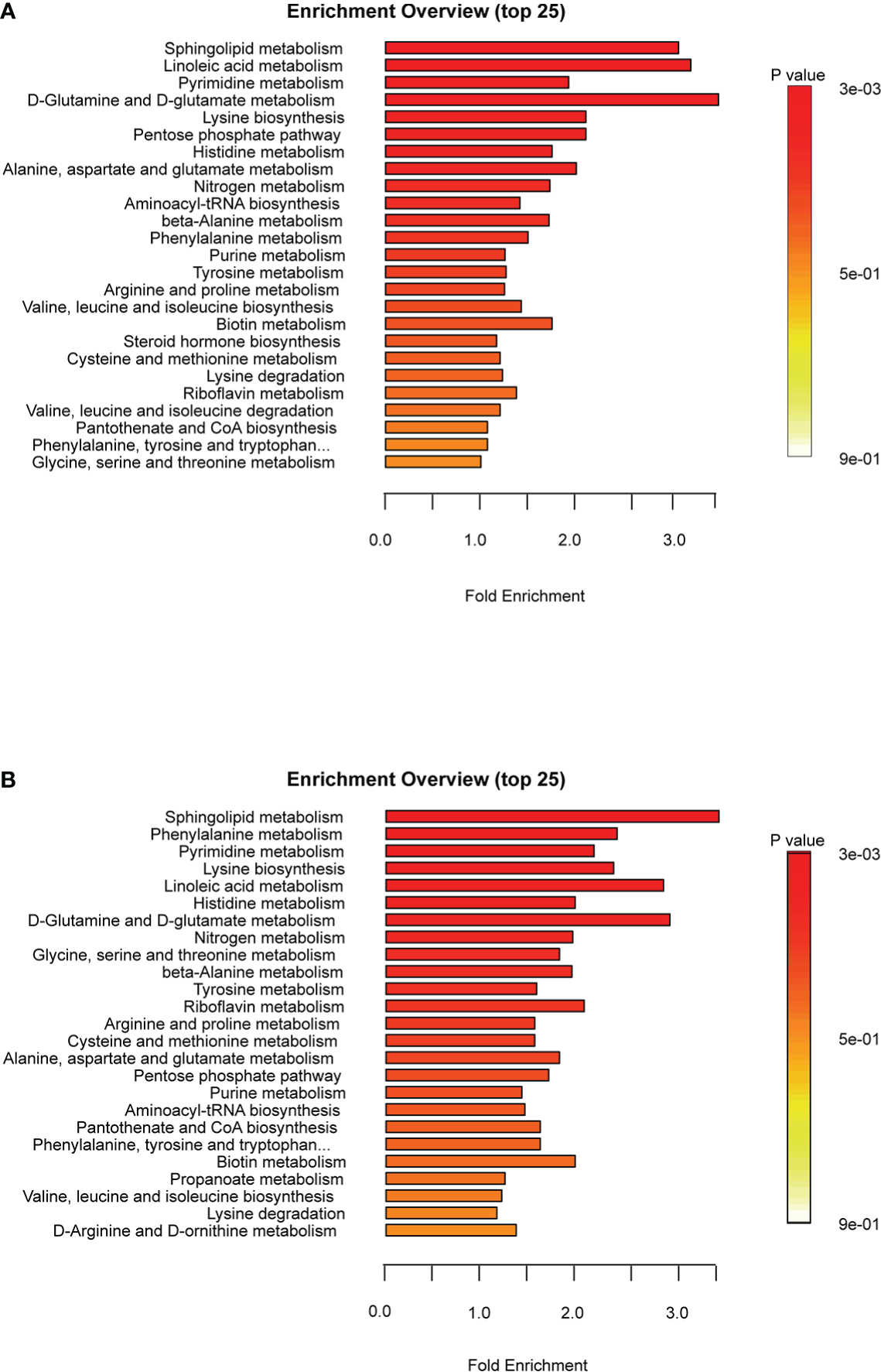 For the metabolomics analysis, differential metabolites (DMs) between groups were determined by Student’s t test based on p value ≤0.05, combined with absolute Log2FC (fold change) ≥1 and variable importance in projection (VIP) values ≥1 from the OPLS-DA model. Venn plot was further constructed by jvenn online tool (http://jvenn.toulouse.inra.fr/app/example.html). The DMs were further annotated and mapped to the KEGG compound and pathway databases (http://www.kegg.jp/kegg/compound/ and http://www.kegg.jp/kegg/pathway.html) using a hypergeometric distribution test using the R language package MetaboAnalystR to identify the significantly enriched pathways, where p < 0.05 was considered to be significant.