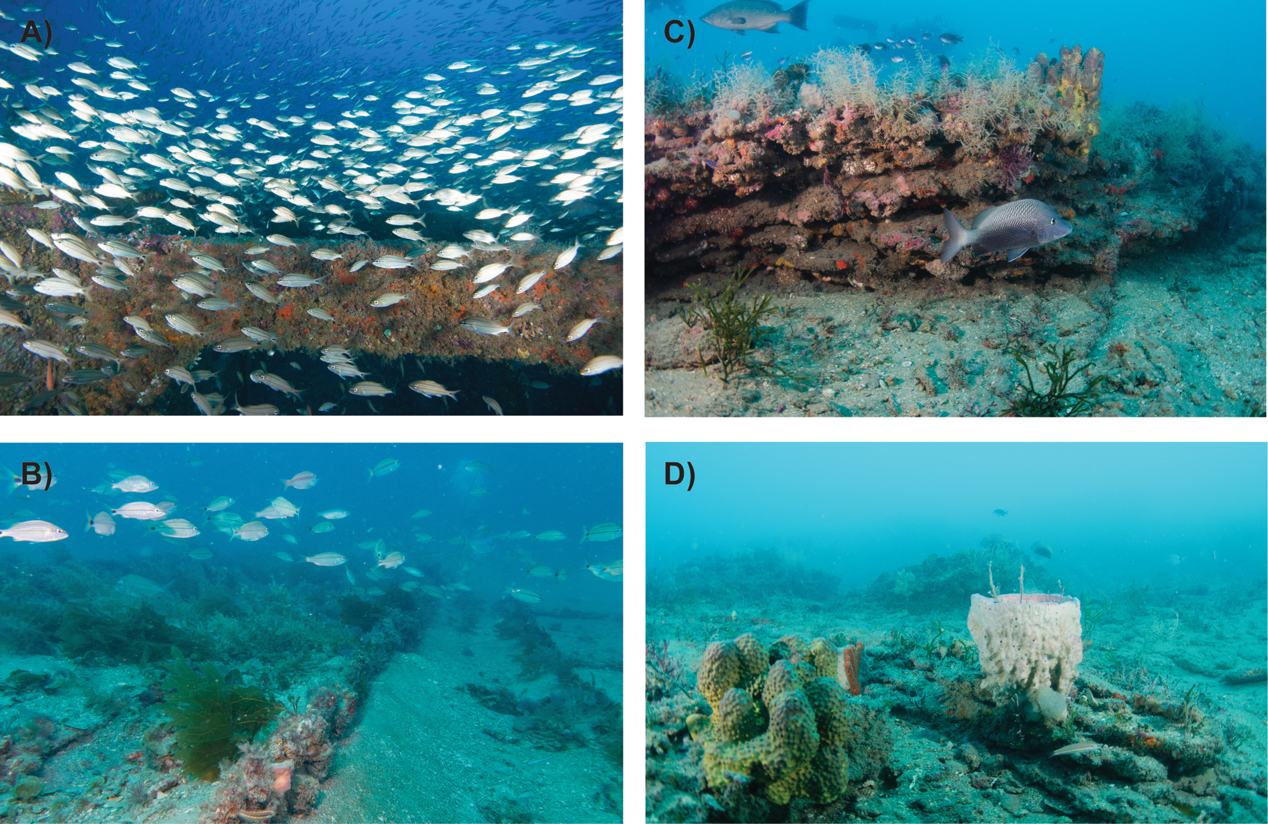Underwater images of artificial reefs (A, B) and natural reefs (C, D) on the southeast US continental shelf. (A) Artificial reef created by a ship. (B) Artificial reef formed from a train boxcar. (C) High-relief rocky reef. (D) Low-relief rocky reef. Photos by John McCord/Coastal Studies Institute (A), Cory Ames/NCCOS (B), Dave Sybert (C, D).
