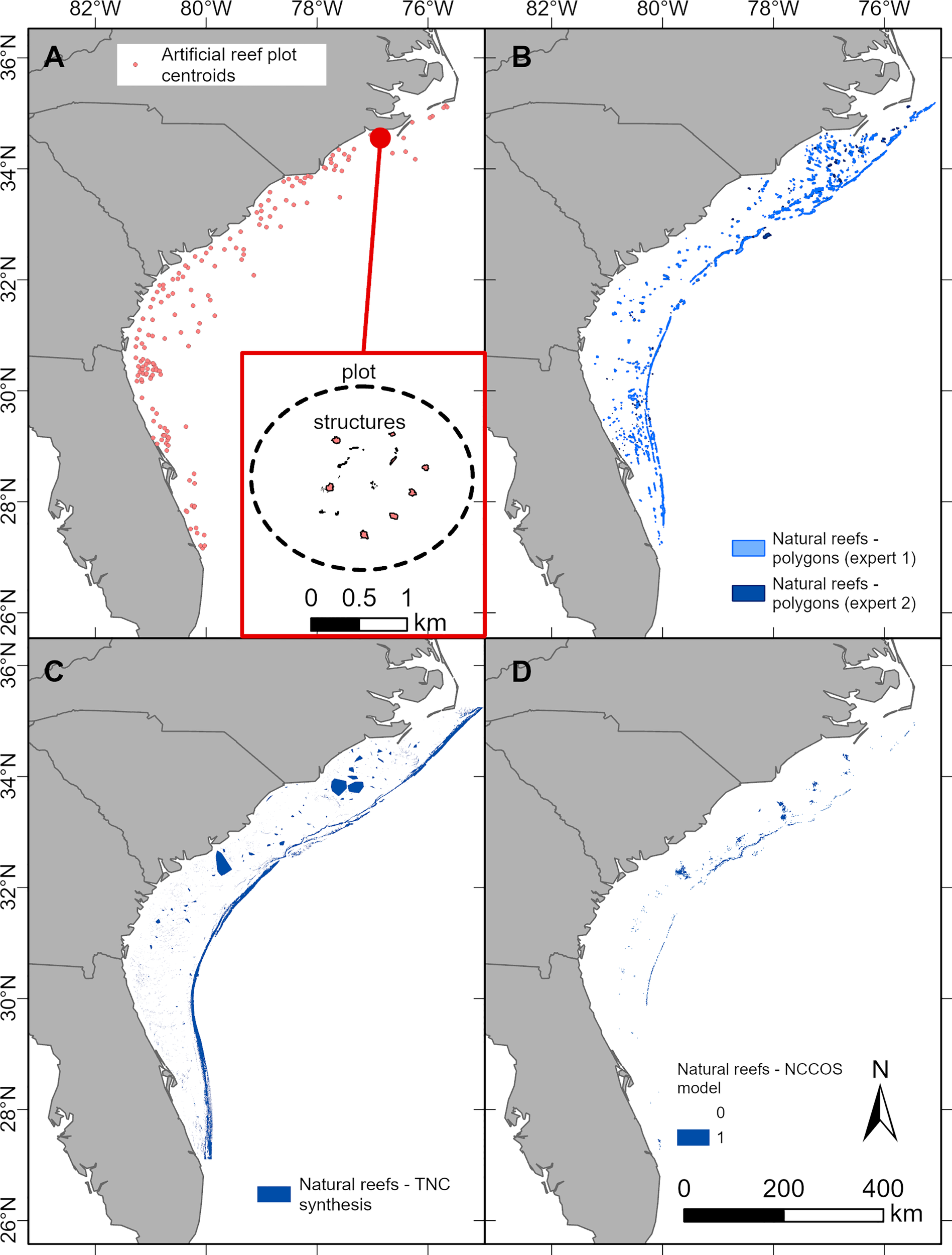 Locations of artificial reefs (A) and natural reefs (B–D) along the southeastern US continental shelf. (A) Artificial reef locations correspond to centroids of permitted artificial reef plots, and the size of the artificial reef dots corresponding to each plot is not to scale. The inset in panel A depicts one NC artificial reef permitted plot (dashed line) and the artificial reef structures (red polygons) within. (B) Natural reefs delineated by expert-drawn polygons. (C) Natural reefs predicted by the TNC synthesis. (D) Natural reefs predicted by the NCCOS model (likelihood >0.63).