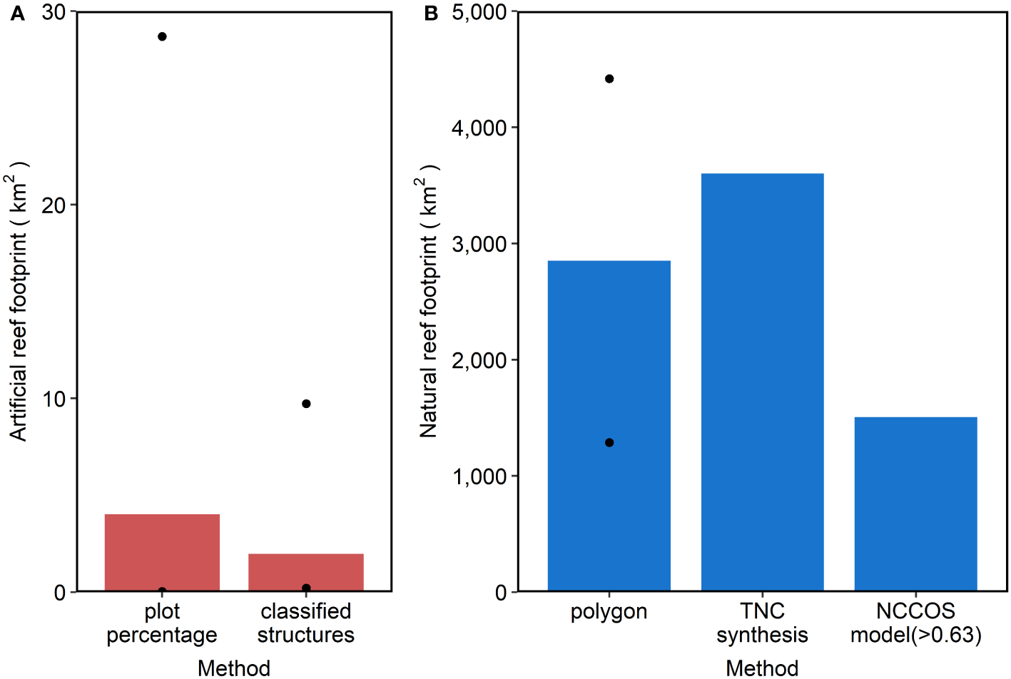 Extent of artificial reefs (A, red) and natural reefs (B, blue) for the entire SEUS region. Measured approach for artificial reef footprint not shown because only applied to NC. Black circles represent the maximum and minimum extent values for applicable methods. Note different y-axis scales.