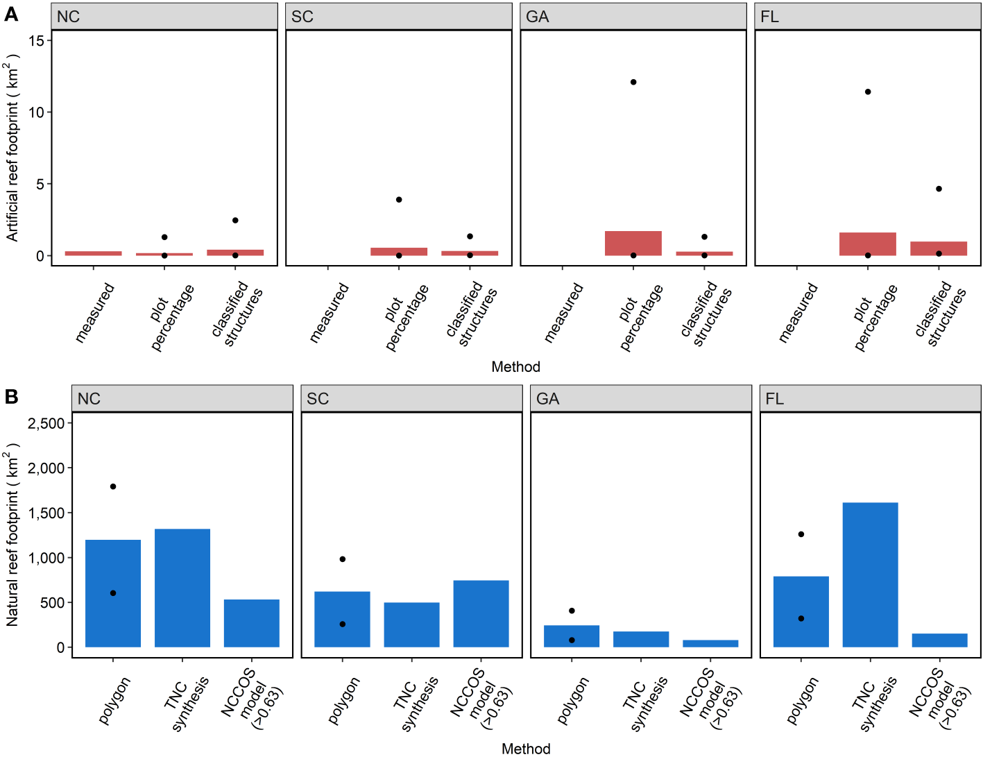 Footprint (km2) of artificial reefs (A, red) and natural reefs (B, blue) by state (columns). Measured approach for artificial reef footprint was only available in NC. Black circles represent the maximum and minimum extent values for applicable methods. Note different y-axis scales between panels (A, B).