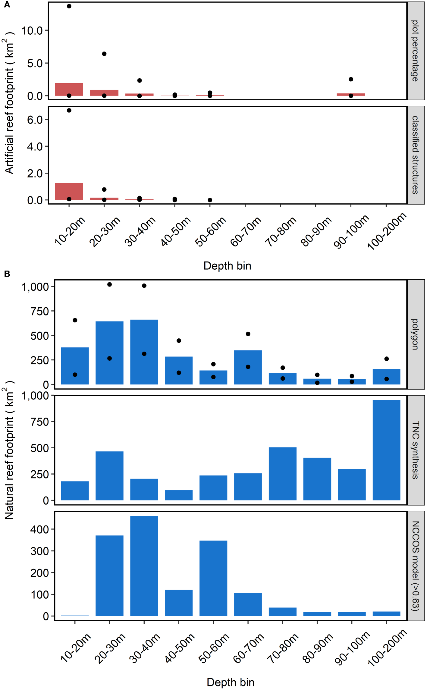 Extent of artificial reefs (A) and natural reefs (B) by depth bin. Measured approach for artificial reef footprint not shown because only applied to NC. Twelve artificial reefs did not have assigned values, so these artificial reefs permitted plots and structures are not represented in this figure. Black circles represent the maximum and minimum extent values for applicable methods. Note different y-axis scales between panels (A, B).
