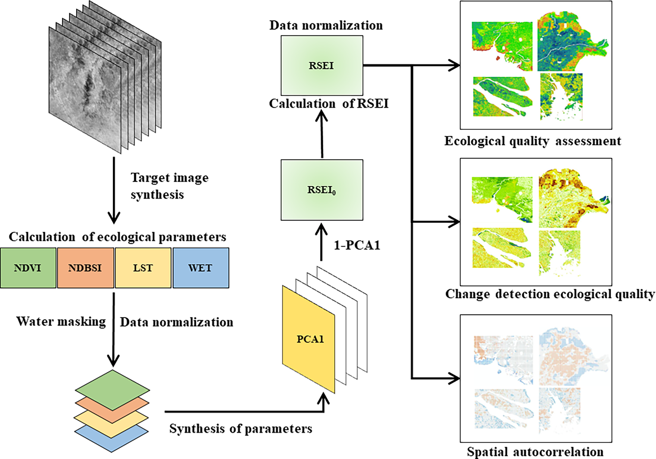To facilitate index measurement and comparison, for the RSEI0 dimensionless processing of remote sensing, the computation formula is as follows: