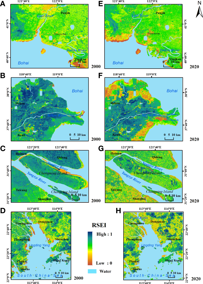 RSEI values of four typical estuaries in 2000 and 2020. (A) LRE in 2000; (B) YRE in 2000; (C) YTRE in 2000; (D) PRE in 2000; (E) LRE in 2020; (F) YRE in 2020; (G) YTRE in 2020; (H) PRE in 2020.