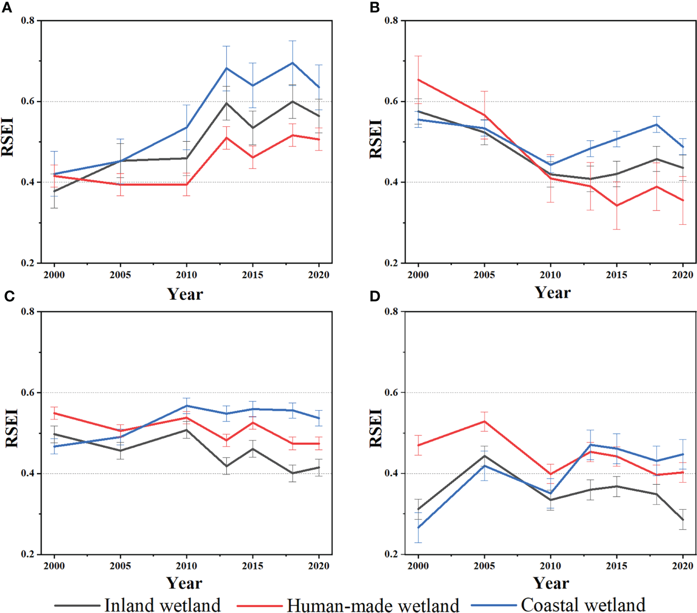 Temporal variations in RSEI in coastal, inland and man-made wetlands from 2000 to 2020 in the four estuaries: (A) LRE, (B) YRE, (C) YTRE and (D) PRE. Error bars represent standard deviations.