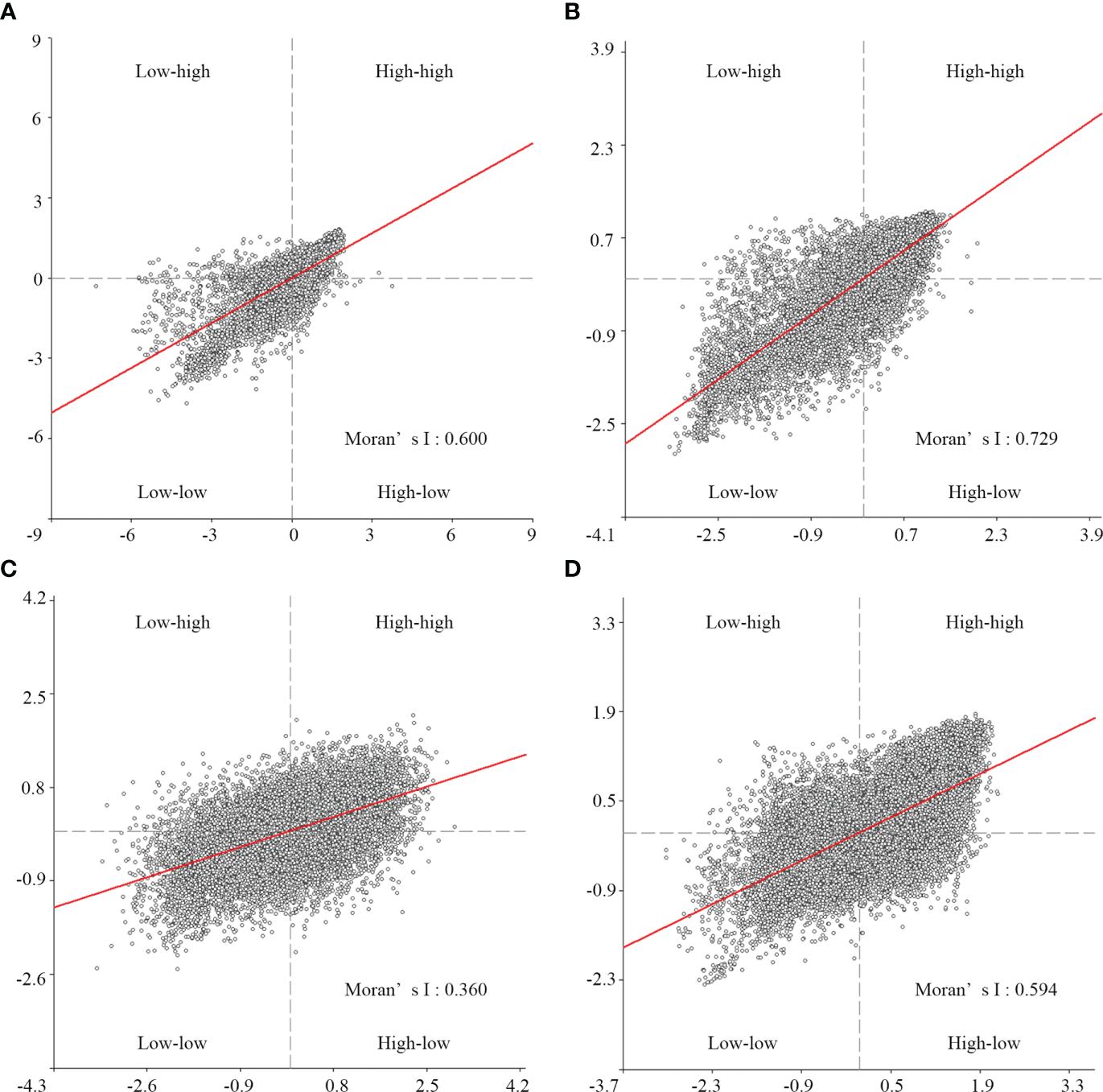 Global Moran’s I scatterplot of RSEIs in 2020 in the (A) Liao River Estuary, (B) Yellow River Estuary, (C) Yangtze River Estuary and (D) Pearl River Estuary.
