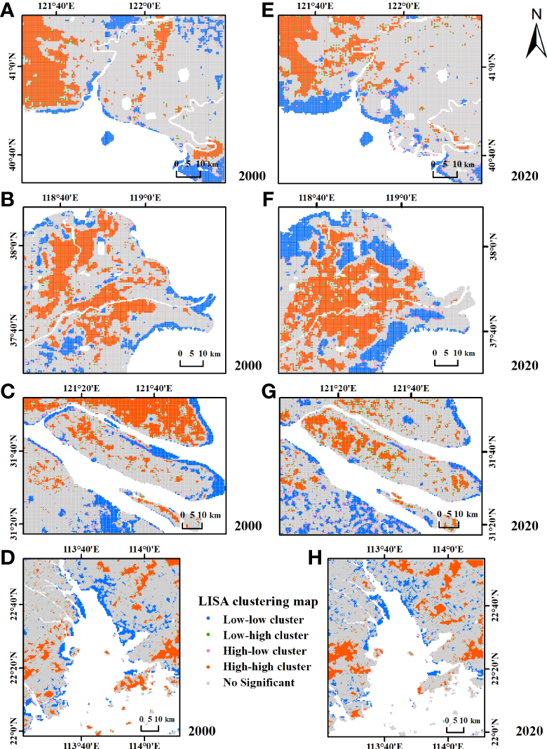 LISA clustering map of RSEIs in the (A) LRE in 2000; (B) YRE in 2000; (C) YTRE in 2000; (D) PRE in 2000; (E) LRE in 2020; (F) YRE in 2020; (G) YTRE in 2020; (H) PRE in 2020.