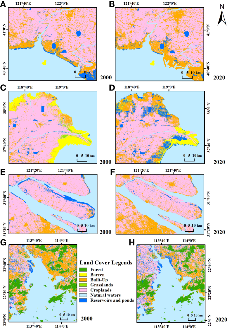 Land cover distribution maps of the (A) LRE in 2000; (B) YRE in 2000; (C) YTRE in 2000; (D) PRE in 2000; (E) LRE in 2020; (F) YRE in 2020; (G) YTRE in 2020; (H) PRE in 2020.