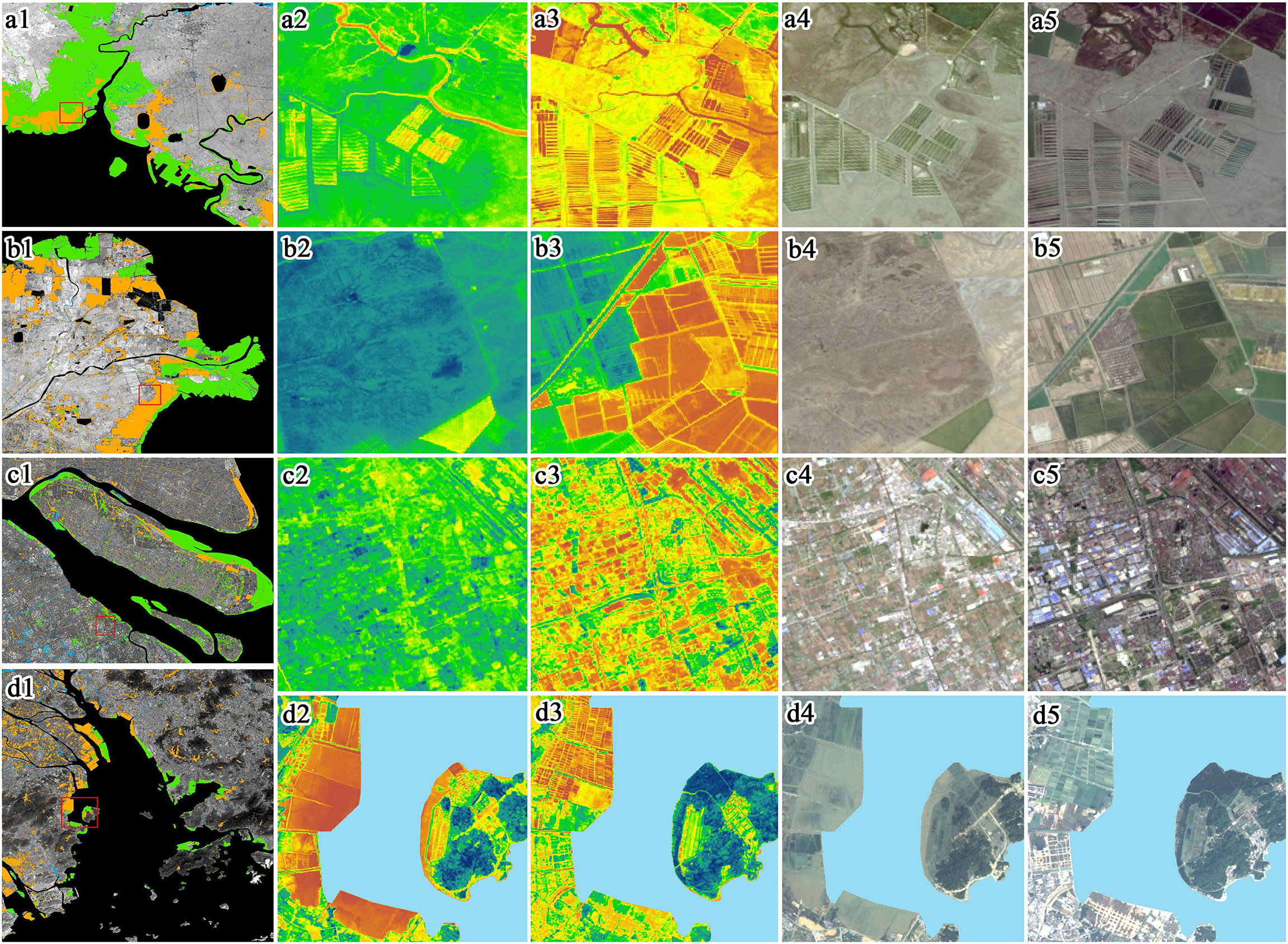 RSEI and land cover in different sample areas. Rows a, b, c and d represent different sample areas. Columns indicate 1) sample area locations (red boxes), 2) RSEIs of the sample areas in 2000 and 3) 2020, 4) true-colour composite Landsat 5 image in 2000 and 5) true-colour composite Landsat 8 image in 2020.